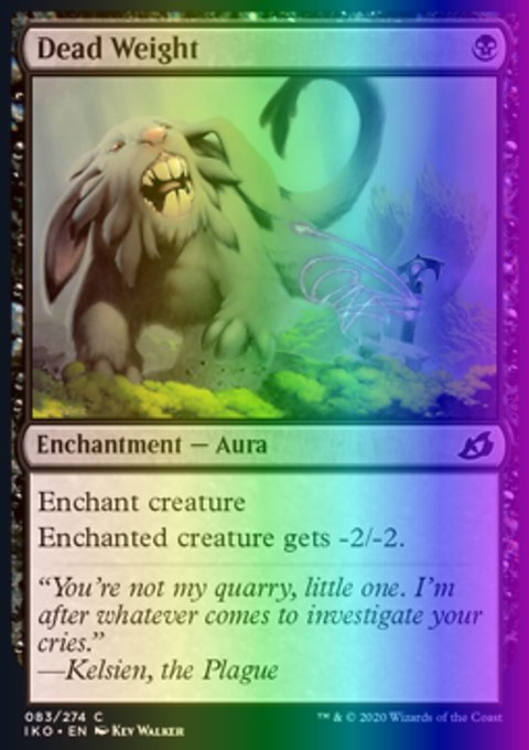 | | Name: | Dead Weight | | Set: | Ikoria Lair of Behemoths | | Number: | 83 | | Condition: | Light Play | | Language: | English | | Variation: | Foil | |