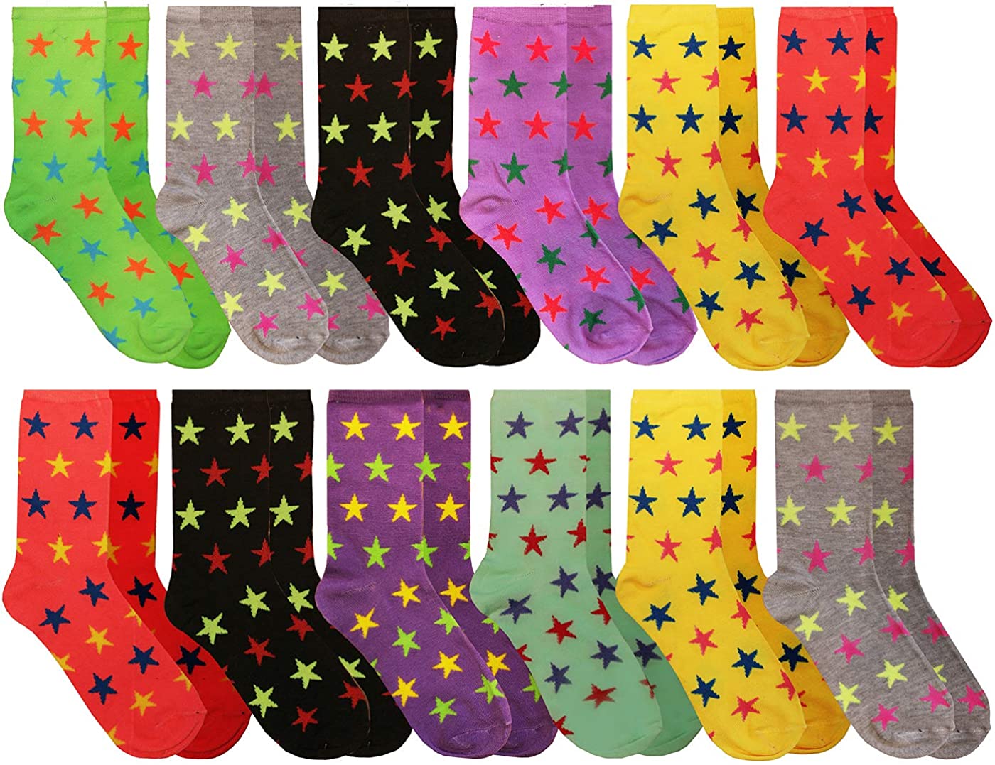 • 12 PAIRS OF WOMENS COTTON CREW SOCKS - **STARS PRINT:**: Get a colorful variety of super cute crew socks, just right for wearing with sneakers or slip ons. Refresh your sock drawer with a fun variety of casual socks in great colors and prints.