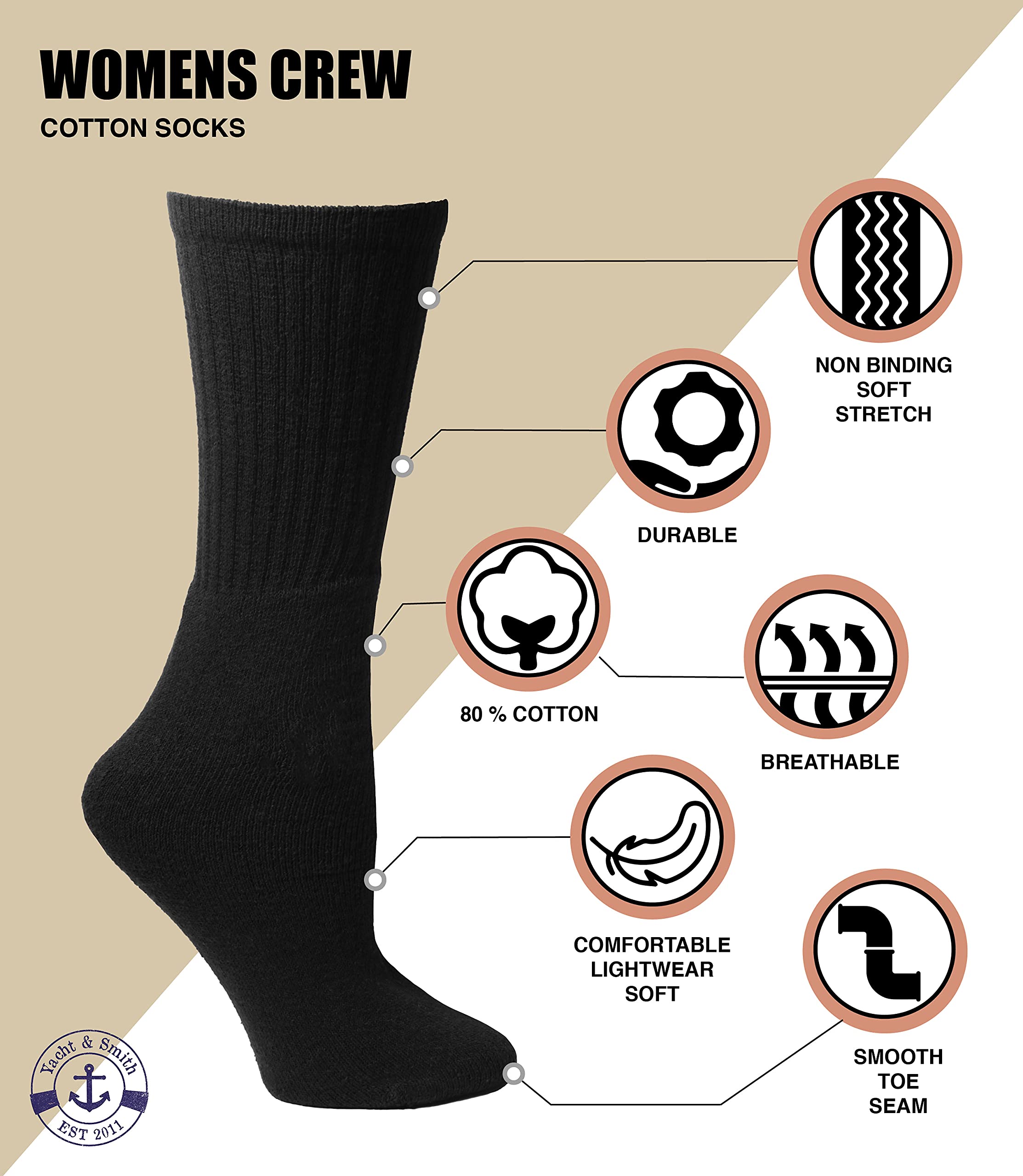 Yacht & Smith by SOCKS'NBULK branded crew socks are known to be a great product geared for basic every day casual wear. Our selection of crew socks are sized ranged from young children to plus size adults. Purchase wholesale socks in bulk for various reasons. Large house hold ? charity ? Organization give away ? shopping for wholesale socks will ensure your purchase was the most economical choice without jeopardizing quality. Wholesale sock deals offers the Yacht & Smith by SOCKS'NBULK branded crew socks in 4 color ways, White Black Gray and Navy with a high cotton content gauge of 80%. Cotton socks last longer than synthetic material socks and wear better during the hot weather season. If your needing this purchase sooner than expected please be sure to e mail us via the amazon contact seller control panel to advise us of your needed date. This will ensure our staff will do our best to make this accommodation.SIZING DETAILS: Sock size 9-11 will fit women's shoe sizes 5-10 . Sock size 10-13 will fit men's shoe sizes 7-12.