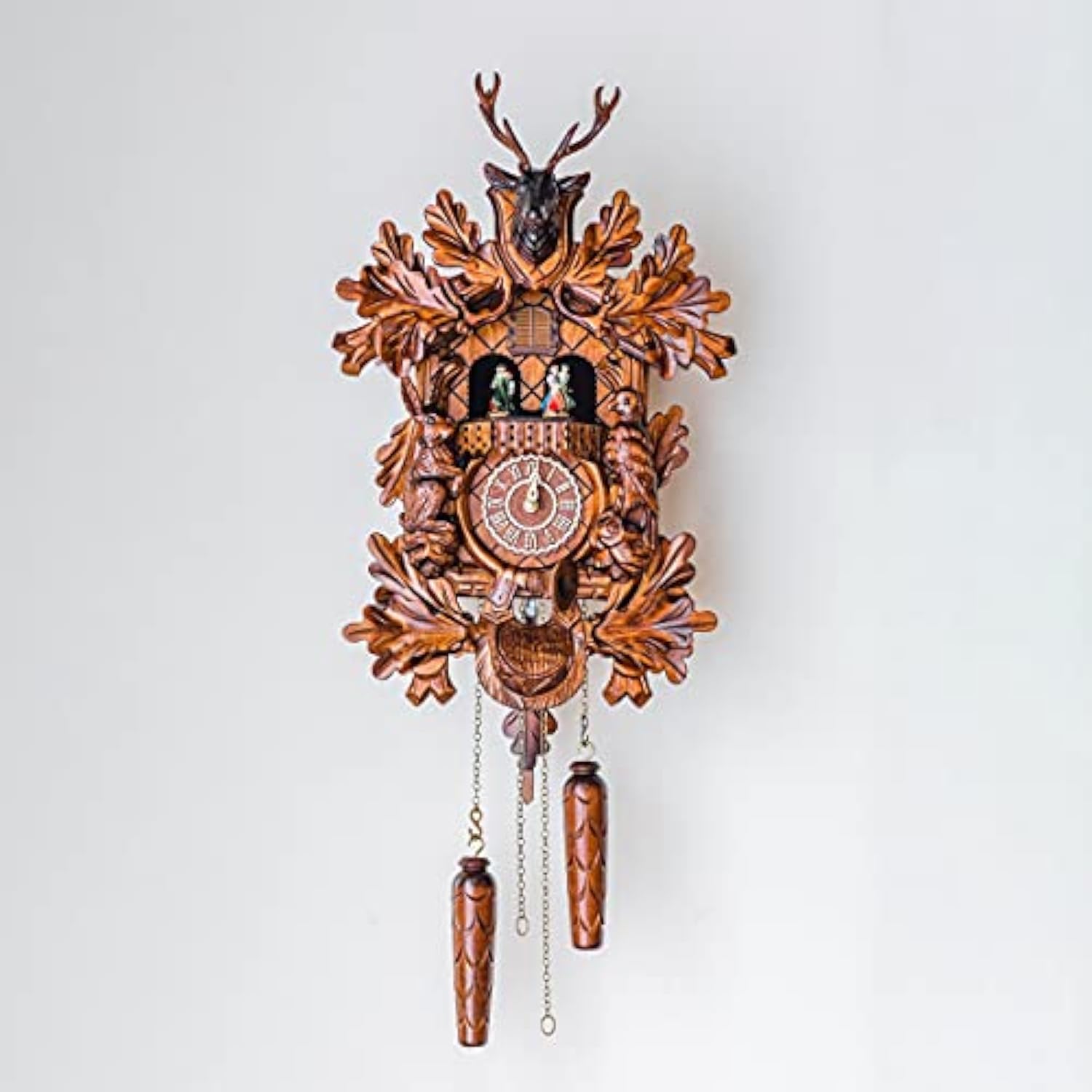 Made in Germany, this wooden traditional quartz cuckoo clock with dancers plays 12 Melodies: Music Box Dancer, Muss i denn zum(wooden heart), Zhivago-Melodie, Mhle im Schwarzwald (Black Forest mill), Bacarole, Ich weiss nicht, was soll es bedeuten (The Lorelei), Oh mein Papa, Frhlicher Wanderer (Happy Wanderer), Que sera, Edelweiss, Fr Elise (Pour Elise), Clementine.