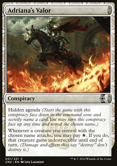 | | Name: | Adriana's Valor | | Set: | Conspiracy Take the Crown | | Number: | 1 | | Condition: | Near Mint or better | | Language: | English | | Variation: | Non-Foil | |