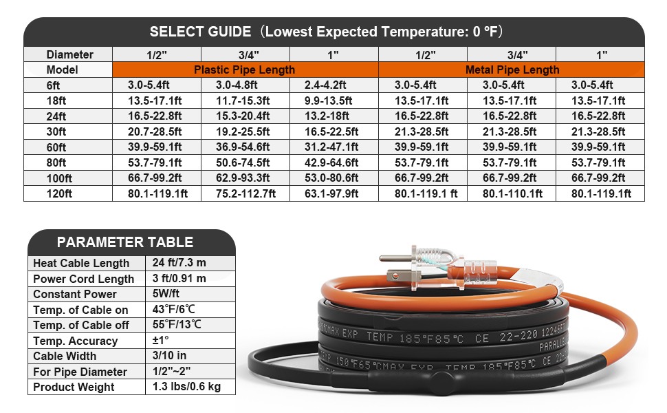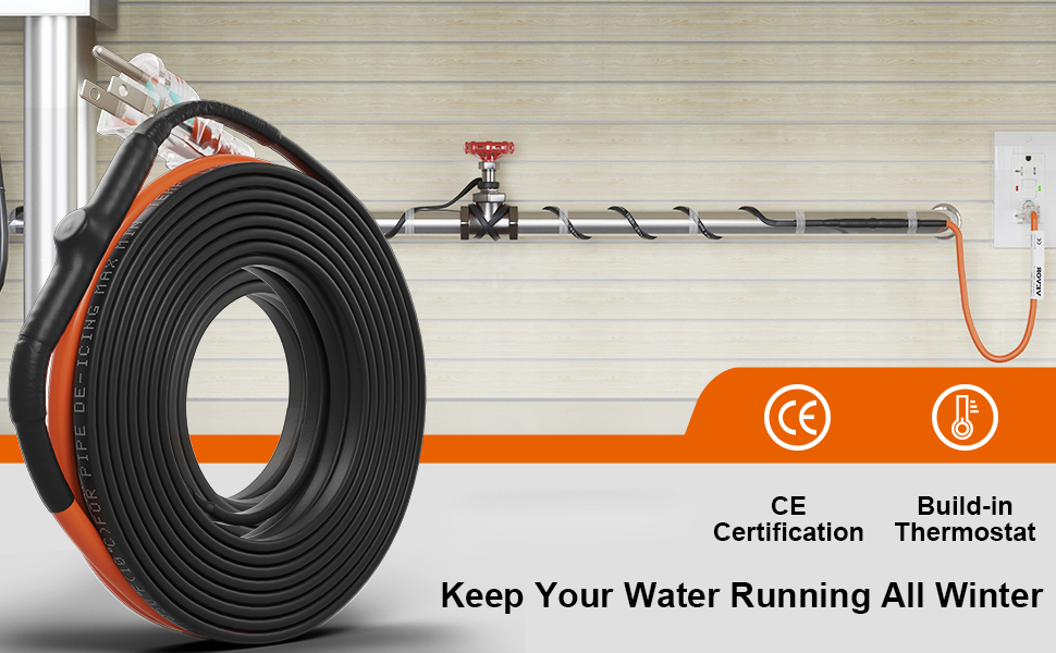 Quality You Can Trust: Our pipe heat cable has 5 W/ft and rapid heating. It only needs 5 minutes to rise 85℉ and keeps your pipes protected from 0℉ cold temperatures! You will never have an issue when everyone else has frozen pipes! CE-approved heating cable with IP68 waterproof rate assures 3 years' worth of use.