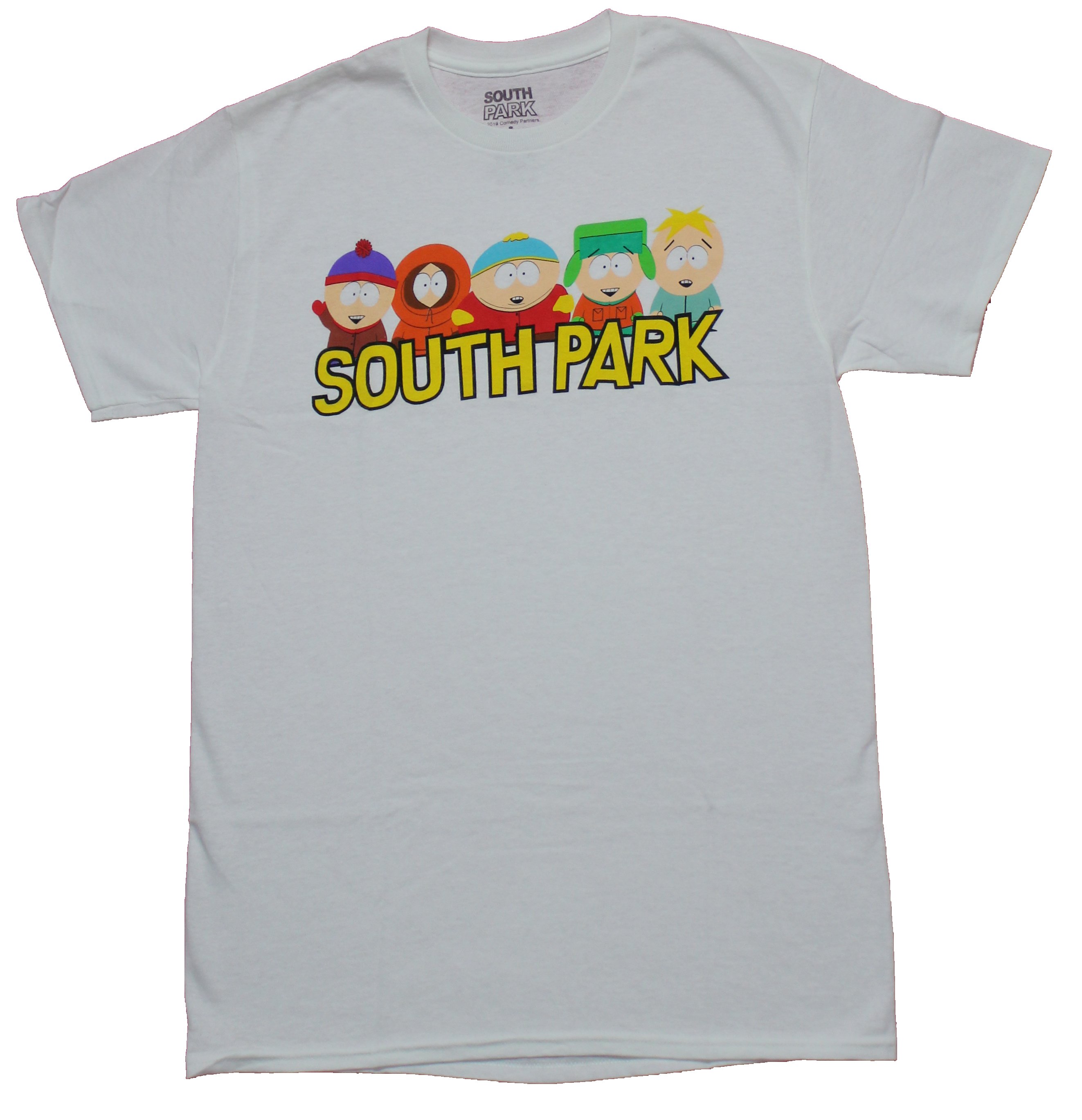 South Park Adult New T-Shirt - 5 Boy Group Over Yellow Word Logo