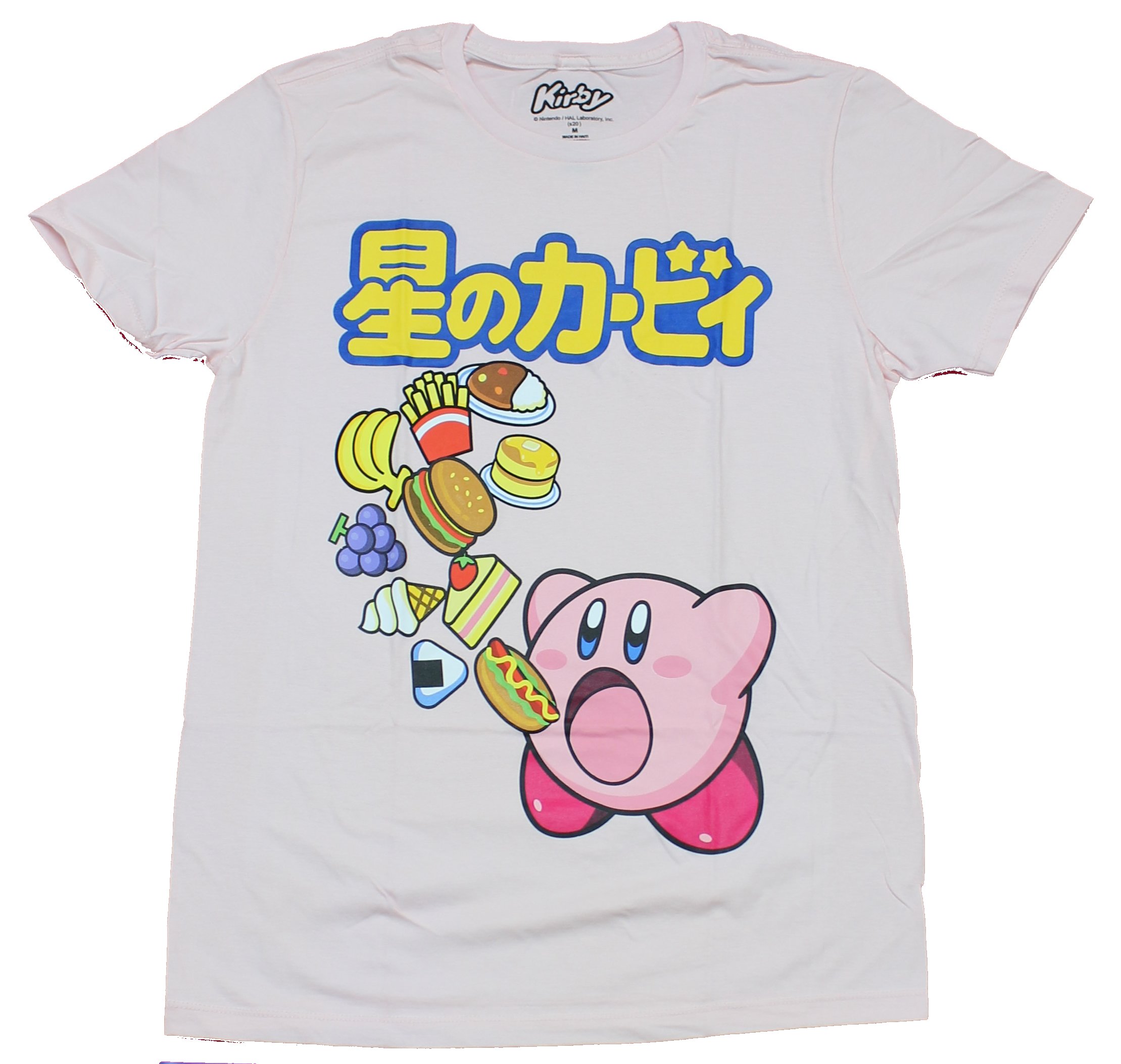 Kirby Mens T-Shirt - Kirby Gobbling A Huge Food Pile Under Kanji