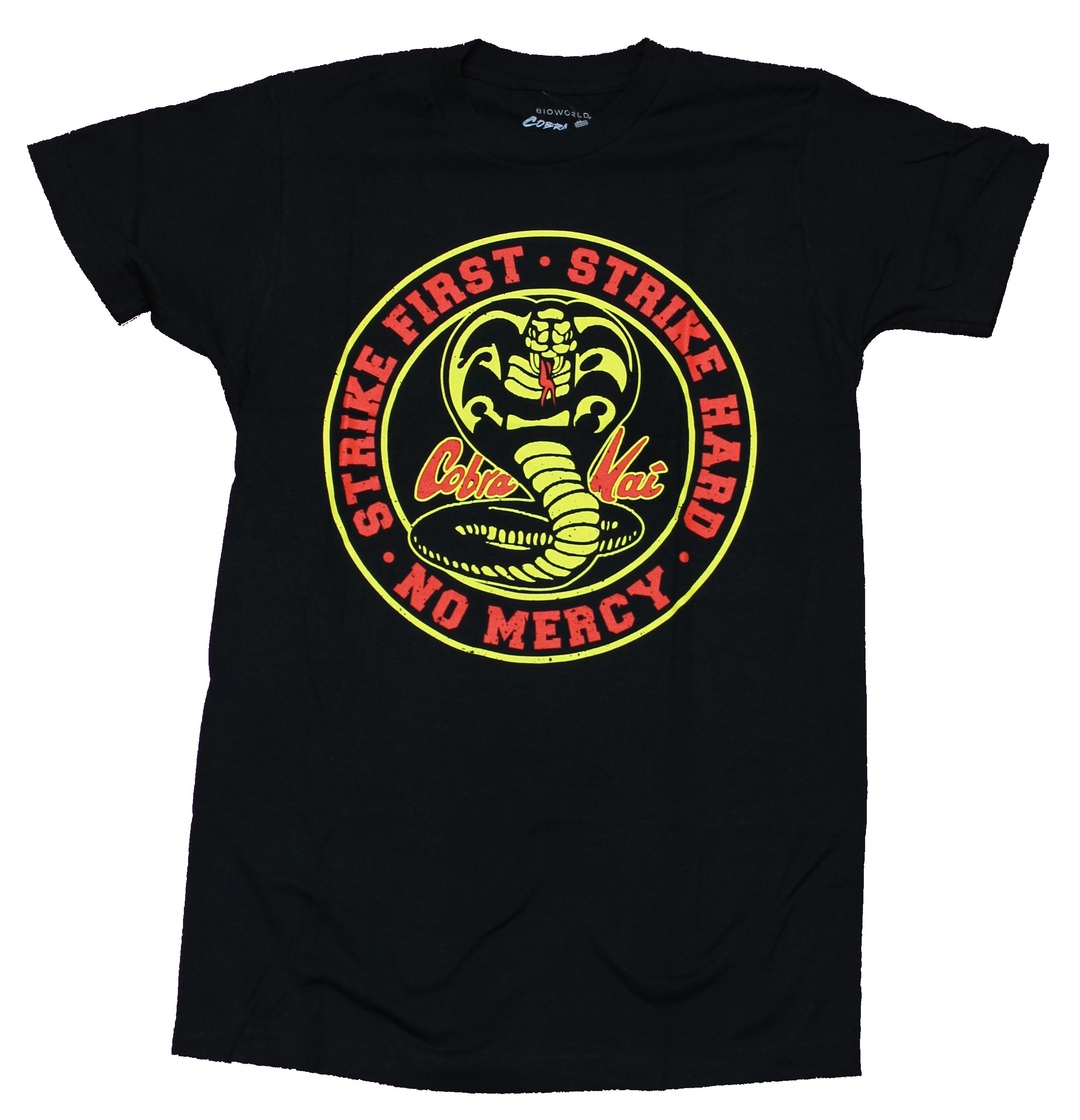 Cobra Kai Mens T-Shirt - Strike Hard Strike Fast No Mercy Cobra Circle Crisp