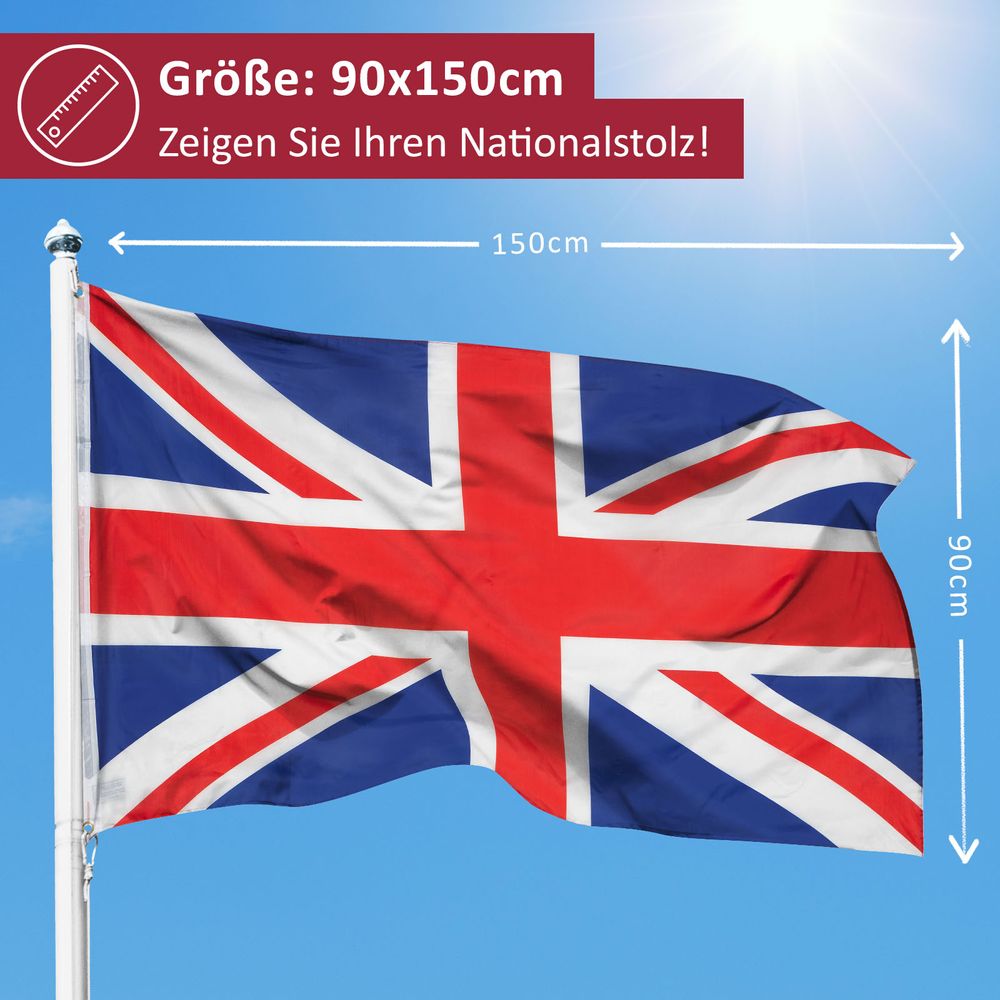 Solltest du nun ein Fan von Großbritannien und online auf der Suche nach einer Großbritannien Flagge sein, die du kaufen kannst, dann bist du in unserem Shop genau richtig. Hier erhältst du nämlich zu einem einmaligen Preis/Leistungs-Verhältnis eine Großbritannien Flagge mit höchster Qualität und einer Größe von 90 x 150 cm sowie Gratisversand noch dazu.