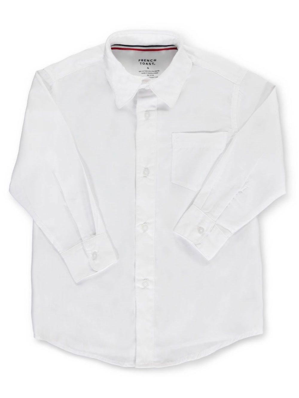 This button-down shirt by French Toast is a comfortable school classic. It features a pointed collar, a chest pocket, and crisp fabric blend for a wrinkle-free tailored look. 55% Cotton, 45% Polyester Machine Wash Cold Made in Bangladesh