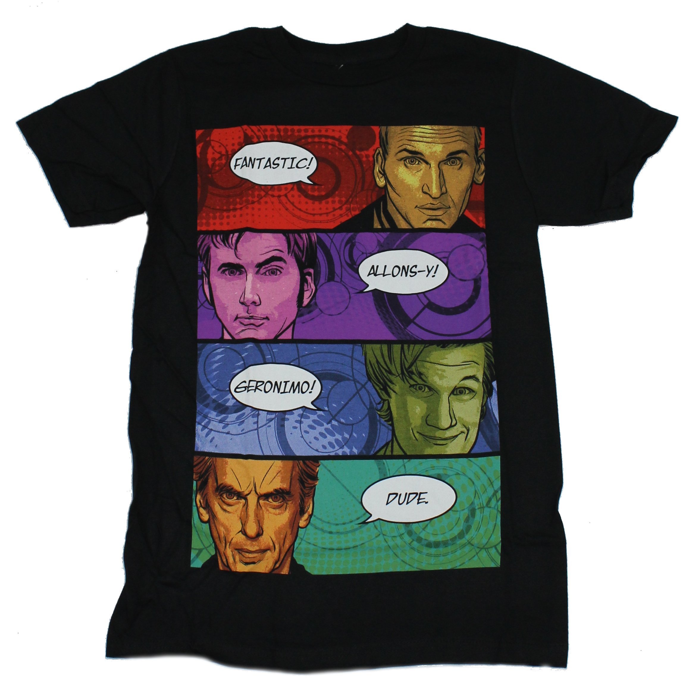 Doctor Who Adult New T-Shirt -4 Recent Doctors & Their Comic Catch Phrases