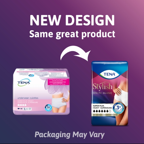 Featuring a stylish, cottony-soft fabric, our TENA Super Plus Heavy Incontinence Underwear is form fitting and designed to look and feel like regular underwear with triple protection against bladder leaks, urine odor, and wetness and Super Plus absorbency for moderate to heavy bladder leakage. This underwear can be easily pulled on and off and has tear-away sides for efficient removal. New look. Same TENA protection.