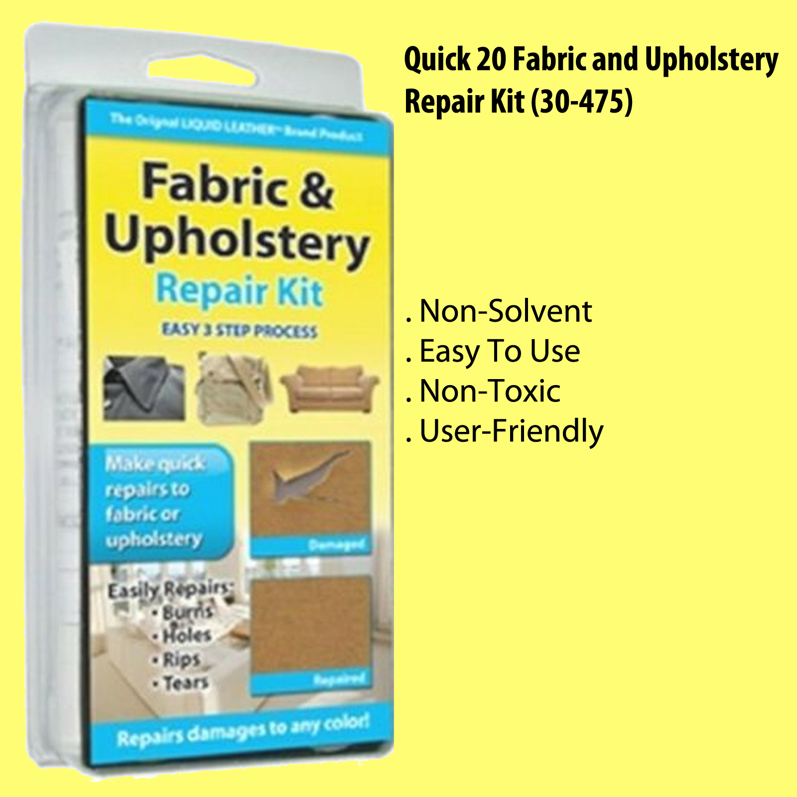 Repair any damaged Fabric with this easy to use Kit. Every home and office has dozens of little eyesores this great kit can repair like new! The patented process involves applying one or two layers of clear adhesive to fill in the damaged spot. Then you mix to match the proper color and apply it to the applicator screen...the screen is placed over the clear adhesive and lightly moved back and forth, thus dispersing the color fabric fibers over the adhesive. Let the repair dry, and apply a light spray of bonding adhesive. That's it! We give you everything you need in the kit to do a truly profesional repair! This kit contains: 7 fiber colors, 2 fabric adhesives, spatula, applicator screen, backing fiber, mixing container with steel ball, instructions with matching color guide.