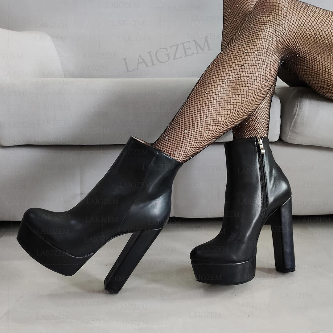 SEIIHEM Women Ankle Boots Round Toe Side Zip Block Thick High Heels Booties Faux Leather Black Shoes Woman Big Size 41 43 47 52