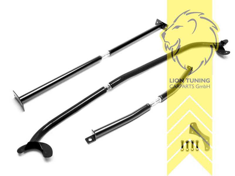 Unsere robusten Domstrebenkits bestehen aus 3 Einzelstreben. Sie werden aus hochwertigem Stahl hergestellt. Die Befestigung erfolgt auf den vorderen, bzw. hinteren Domen. Die Querlenkerstrebe wird vorne unten im Bereich der Querlenker unter dem Motor verbaut - Sie stützt die Querlenker ab. Durch das integrierte Verstellelement der vorderen Strebe kann man die Dome leicht auf Druck oder Zug einstellen.Sinn und Zeck einer Domstrebe ist es, die Steifigkeit der Karosserie zu verbessern. Je weniger sich die Karosserie verwindet, desto präziser lenkt das Fahrzeug ein. Das Fahrzeug fährt sich spürbar sportlicher. Bei Sportfahrwerken, bzw. Gewindefahrwerken empfehlen wir daher den Einbau einer Domstrebe.- massive Verarbeitung