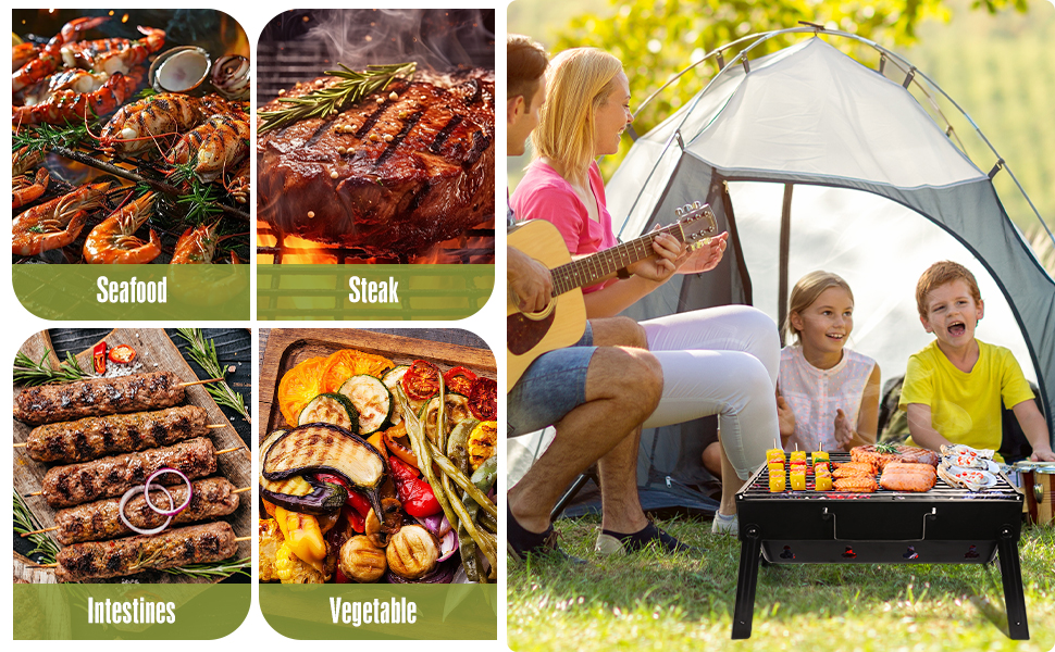 Easy to Set Up and to Use: This portable barbecue grill is perfect for small house parties, camping, hiking, backpacking, picnics. It's perfect to cook delicious food on this charcoal grill like burgers, fish, steak, hot dogs, kebab, corn and more.