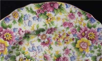 This distinctive pattern was produced by Royal Winton and is now discontinued. It features a chintz design on a cream background with gold trim.