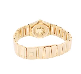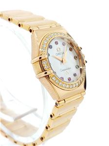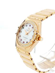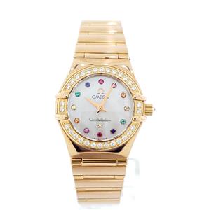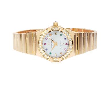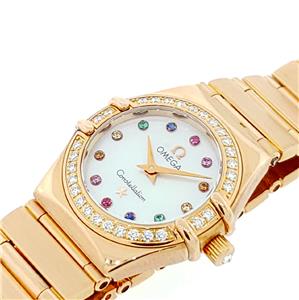 Omega Constellation mini 22.5mm case diameter. 18k rose gold case and bracelet. Factory diamond bezel and White Mother-Of-Pearl multi-colored sapphire stone dial. Swiss quartz Omega Cal. 1456 movement. Sapphire crystal. In excellent condition. Bracelet fits approx. up to 7.5 inch wrist size. Watch only with presention box.