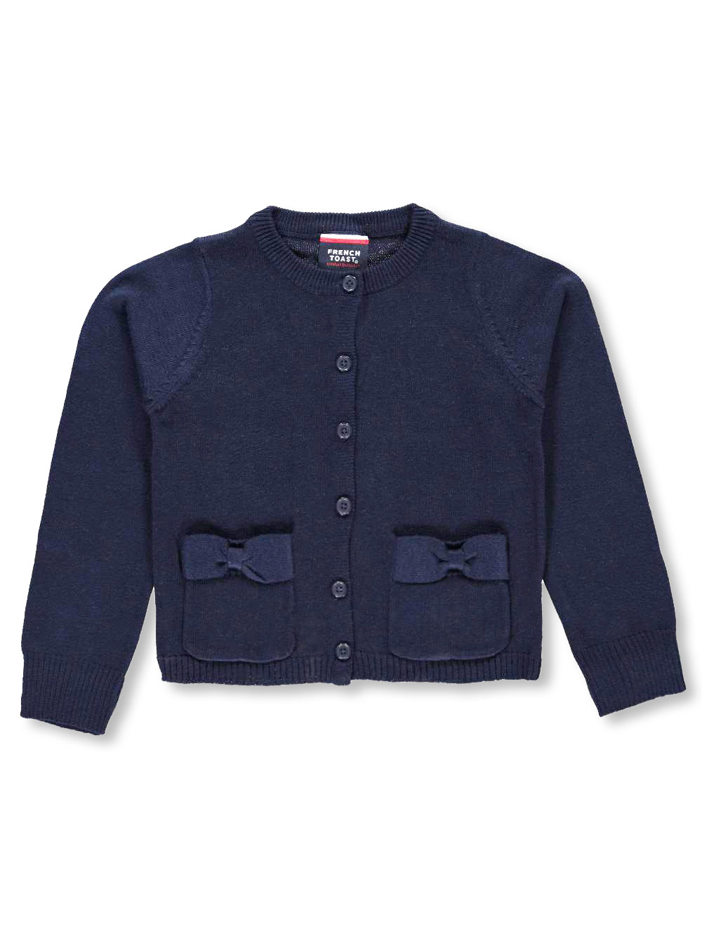 This stylish cardigan sweater by French Toast puts a fun twist on a school classic. French Toast cardigan Spill-resistant acrylic construction Crewneck Patch pockets Bow accents Full button placket Ribbed trim 100% acrylic Machine wash cold, delicate, inside out Imported