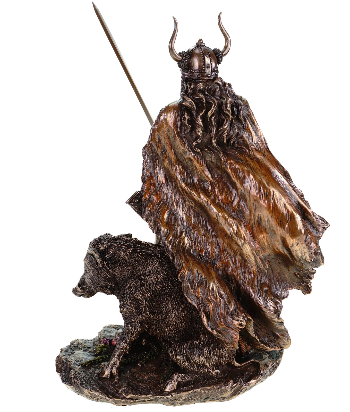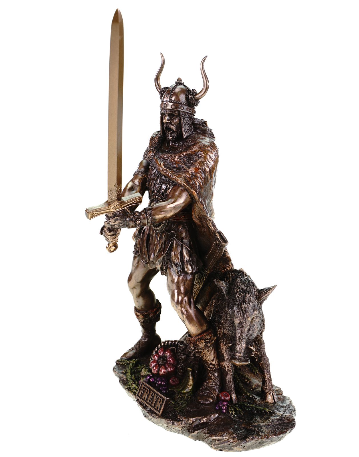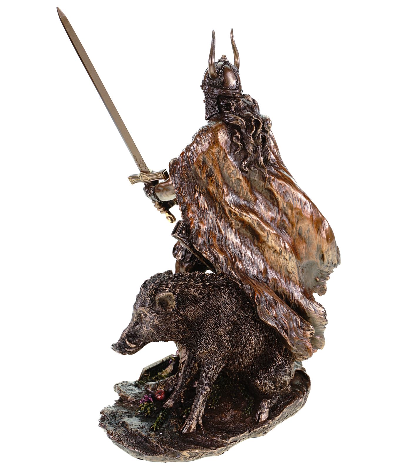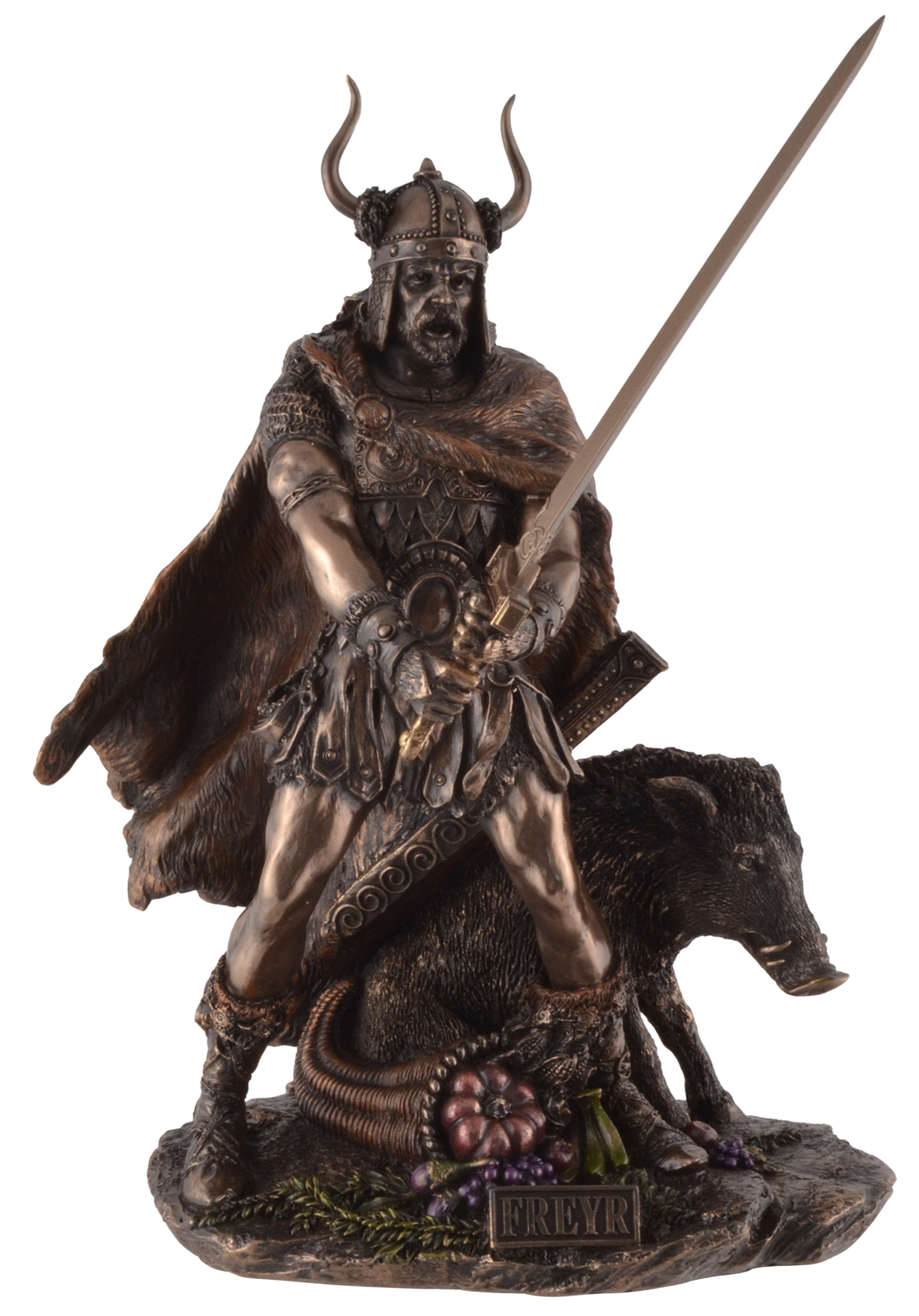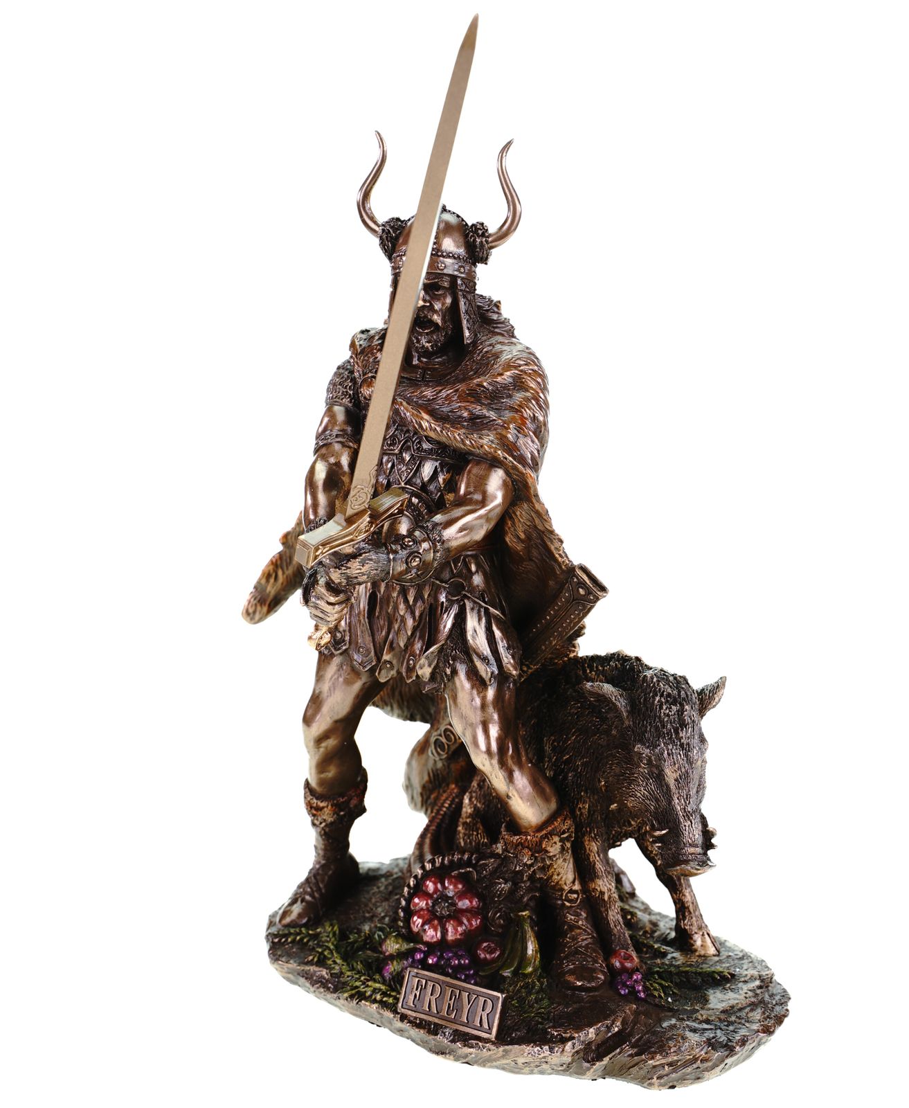 Der nordische Gott Freyr wird in den germanischen Sagen als schön und verführerisch dargestellt. Er ist der nordische Gott der Fruchtbarkeit, der Jagd, des Lichts, des Himmels und der Sonne. Freyr ist auch der Meister der Feen und Kobolde. Die nordische Gottheit entscheidet über den Reichtum und Erfolg der Menschen. Er gibt ihrer Vegetation Leben und wacht über ihre Tiere. In seinem Namen opfern sie Schweine und Pferde, um Frieden, Wohlbefinden, eine gute Ernte und ein gutes Leben zu erhalten. Freyr besaß zudem als Gott der Jagd ein heiliges Tier, den goldborstigen Eber Gullinborsti, der bei unserer Figur mit dargestellt wird. Freyrs Vater ist Njörd, der nordische Gott des Meeres und des Windes. Die nordische Mythologie erzählt, dass seine Mutter Nerthus die Schwester von Njörd war. Als Göttin ruht sie in den Wintermonaten in einem heiligen See und kehrt im Frühling aus dem Schoß der Erde gemeinsam mit allem Leben zurück. Daher wächst Freyr bei seiner Stiefmutter Skadi auf. Der Gott der Fruchtbarkeit hat auch eine Zwillingsschwester, Freya, die selbst die Göttin der Liebe ist.