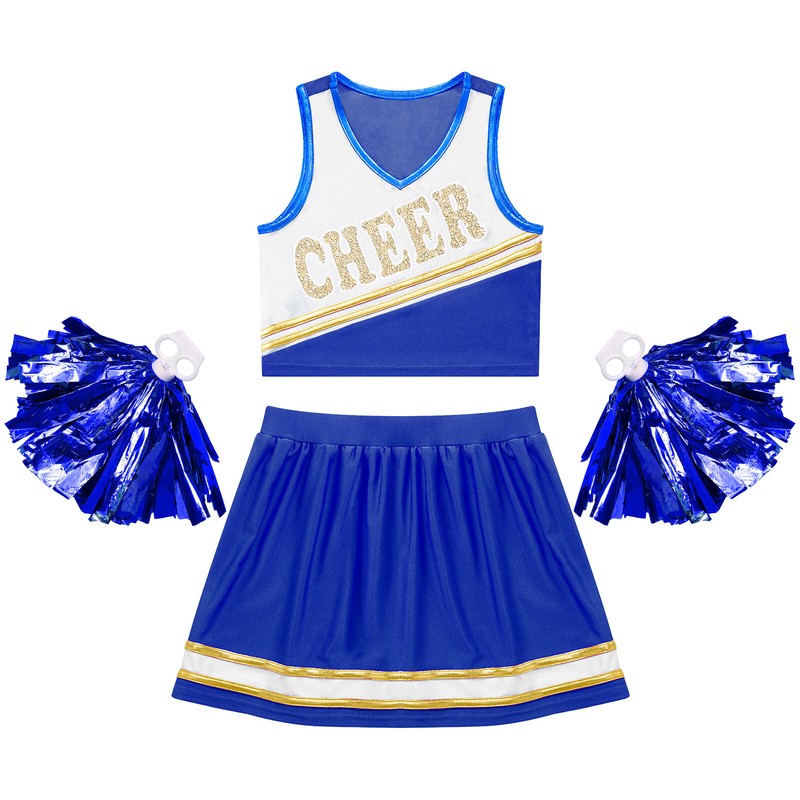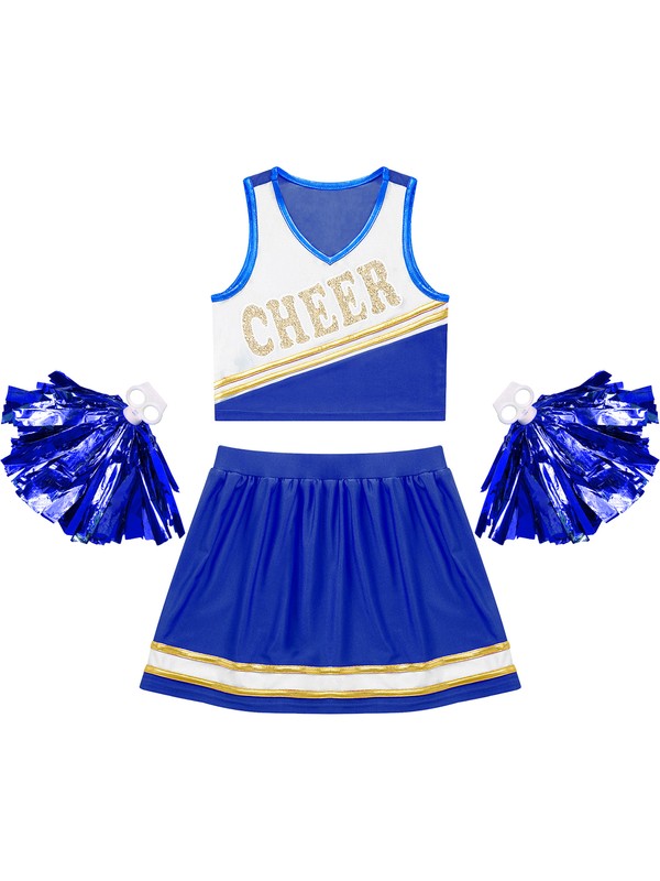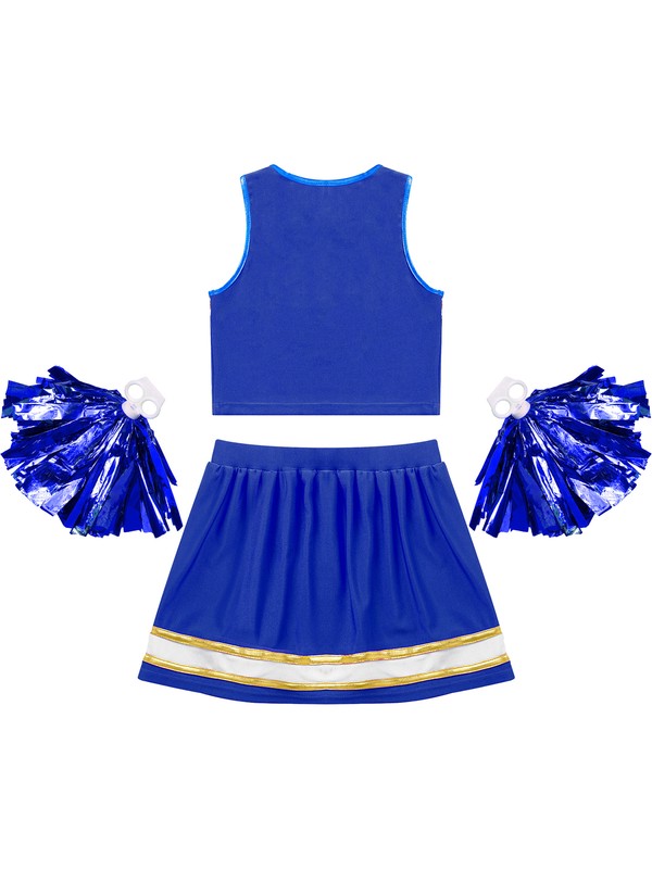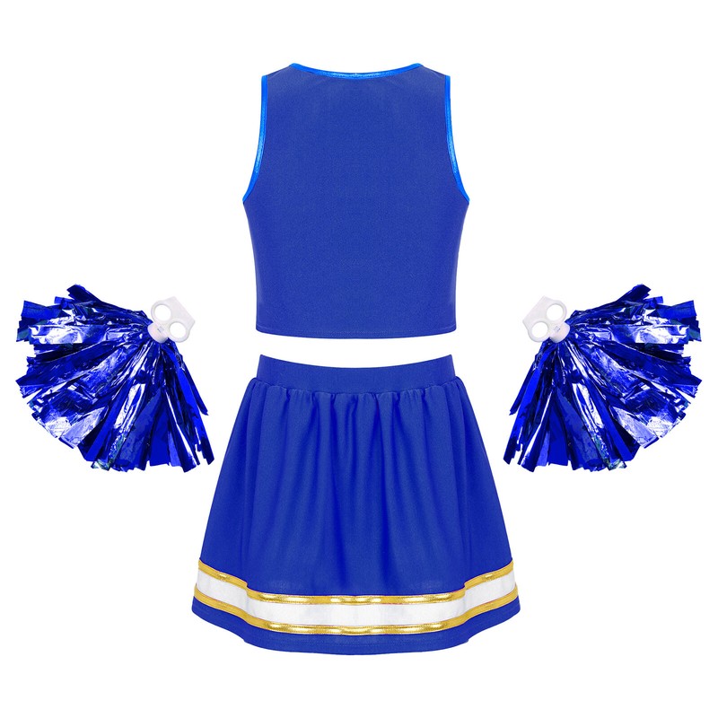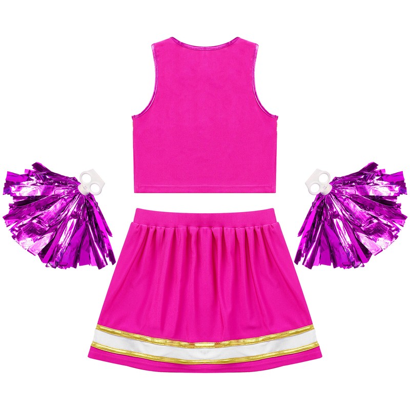 Kids Girls Cheerleading Set Crop Top with Skirt and 1 Pair Tassel Flower Balls.