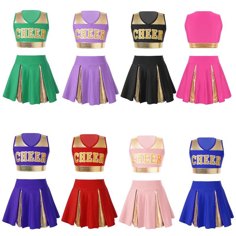 Sleeveless and v neckline crop top, letters CHEER printed in the front, elastic waistband skirt.