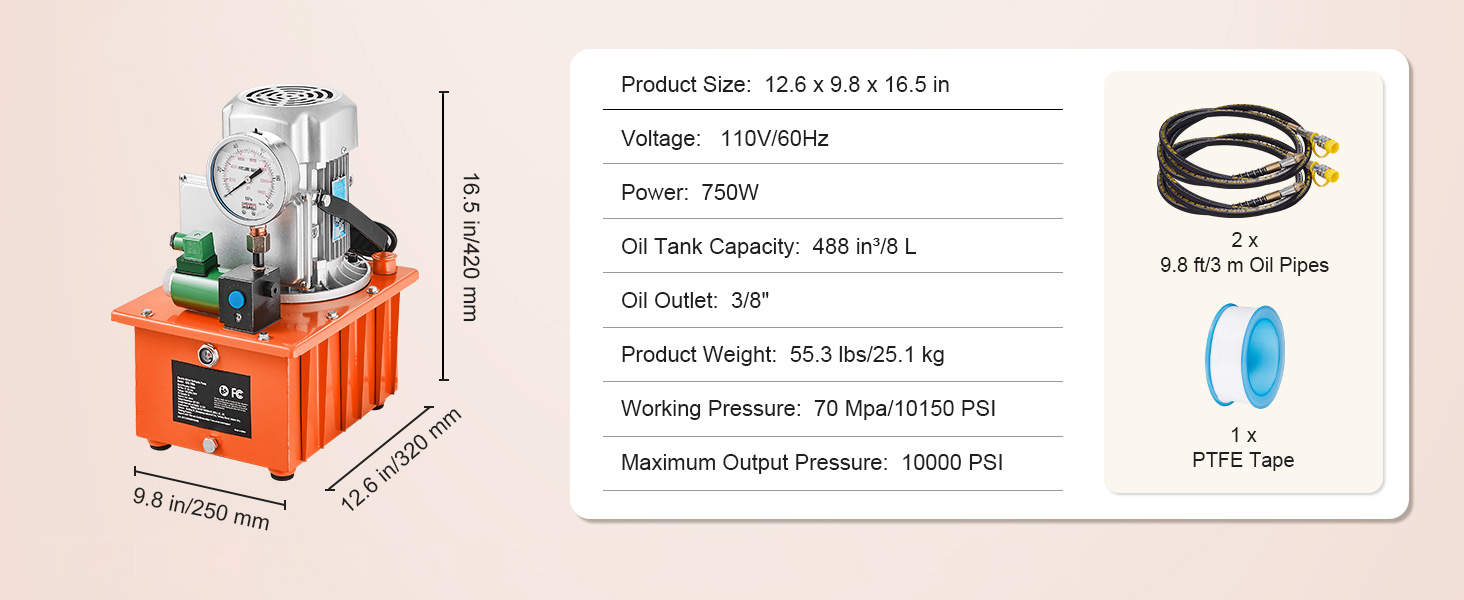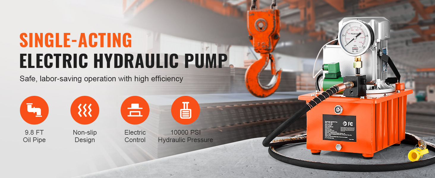 - Efficient & Powerful Motor: Our electric driven hydraulic pump boasts a powerful 750W motor with an aluminum shell, making it incredibly robust and durable. With a max hydraulic pressure of 10,000 PSI, this pump is suitable for various tasks, such as lifting, pressing, bending, straightening, cutting, assembly, and disassembly.