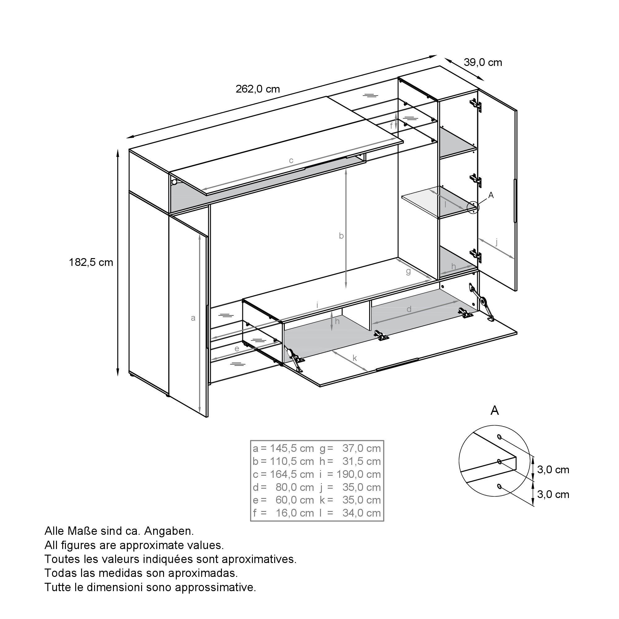 Wohnwand gesamt (BxHxT): 262 x 183 x 39 cm