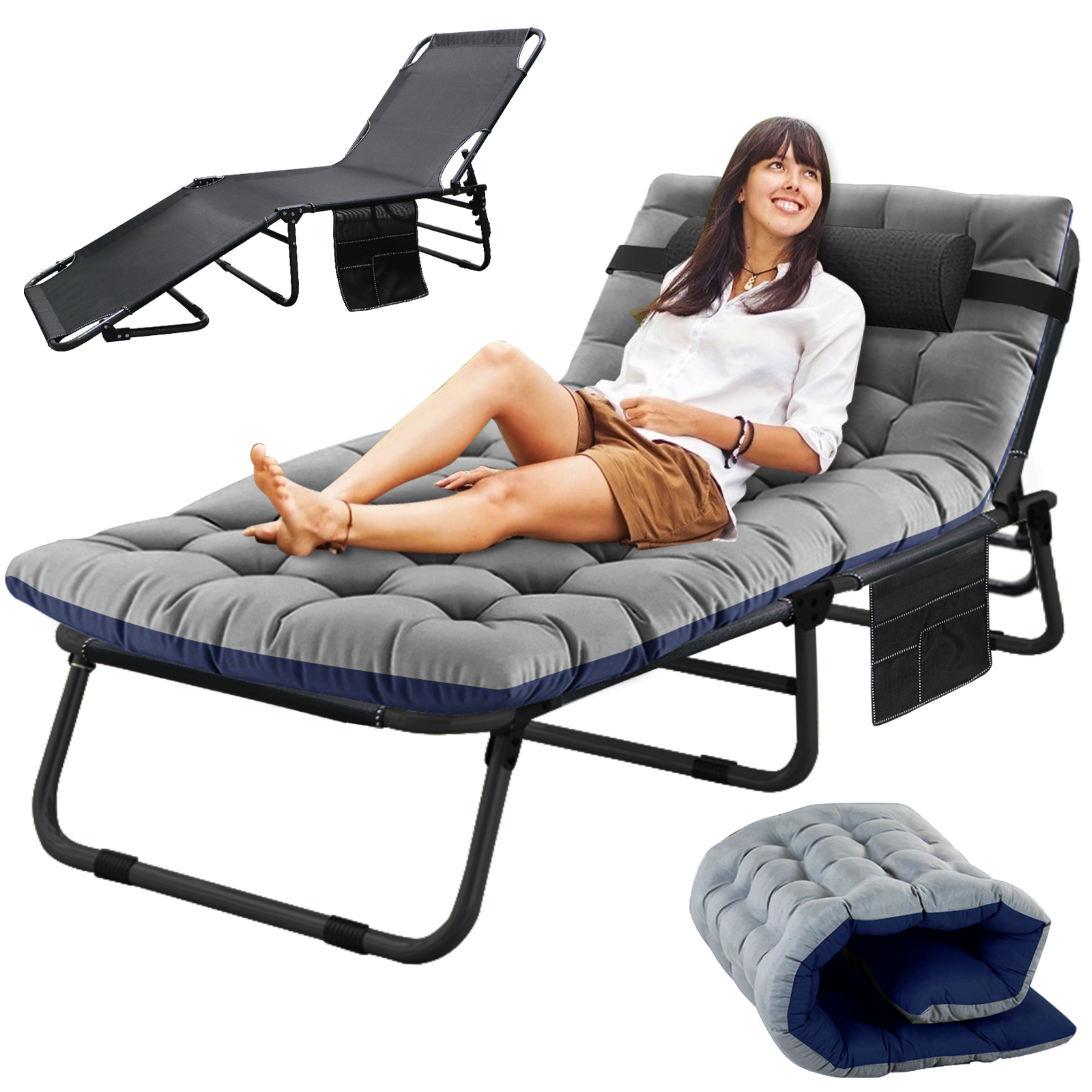 Portable Adjustable folding cot unfold size: L75.2"xW26.8"xH11".Folded size 28.3" x 26.8" x 7.1",only 11.4 pounds,very easy to carry. Perfect for relaxing at home, by the pool, at the beach or as a comfortable place to sleep while camping.The Adjustable folding cot sturdy lounge chair is designed with 4 positions adjustable locking system, which allows you to adjust it to a comfortable position according to your needs. You can recline or lay flat. Our folding Adjustable cot with mattress beach lounger is designed with anti-slip feet pads to ensure stability. The folding camping cot also has a Side pocket , which provides comfortable support for your neck and head to help you fall asleep quickly.Great Adjustable folding cot outdoor cot camping cot for pool,beach,hiking, camping, traveling, hunting; or as a snap cot in the office; also a perfect temporary bed when guests visit your home. Supports up to 400 lbs. Can bear 1 adult or 2 children sleeping on it to rest.