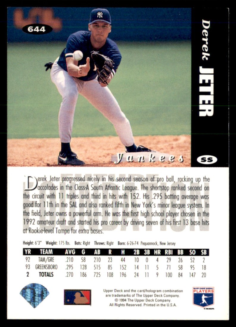 | Description: | Derek Jeter | | Category: | Baseball | | Year: | 1994 | | Product: | Collector's Choice | | Team: | New York Yankees | | Card Number: | 644 | | Dimensions: | 3¼" x 2½" |