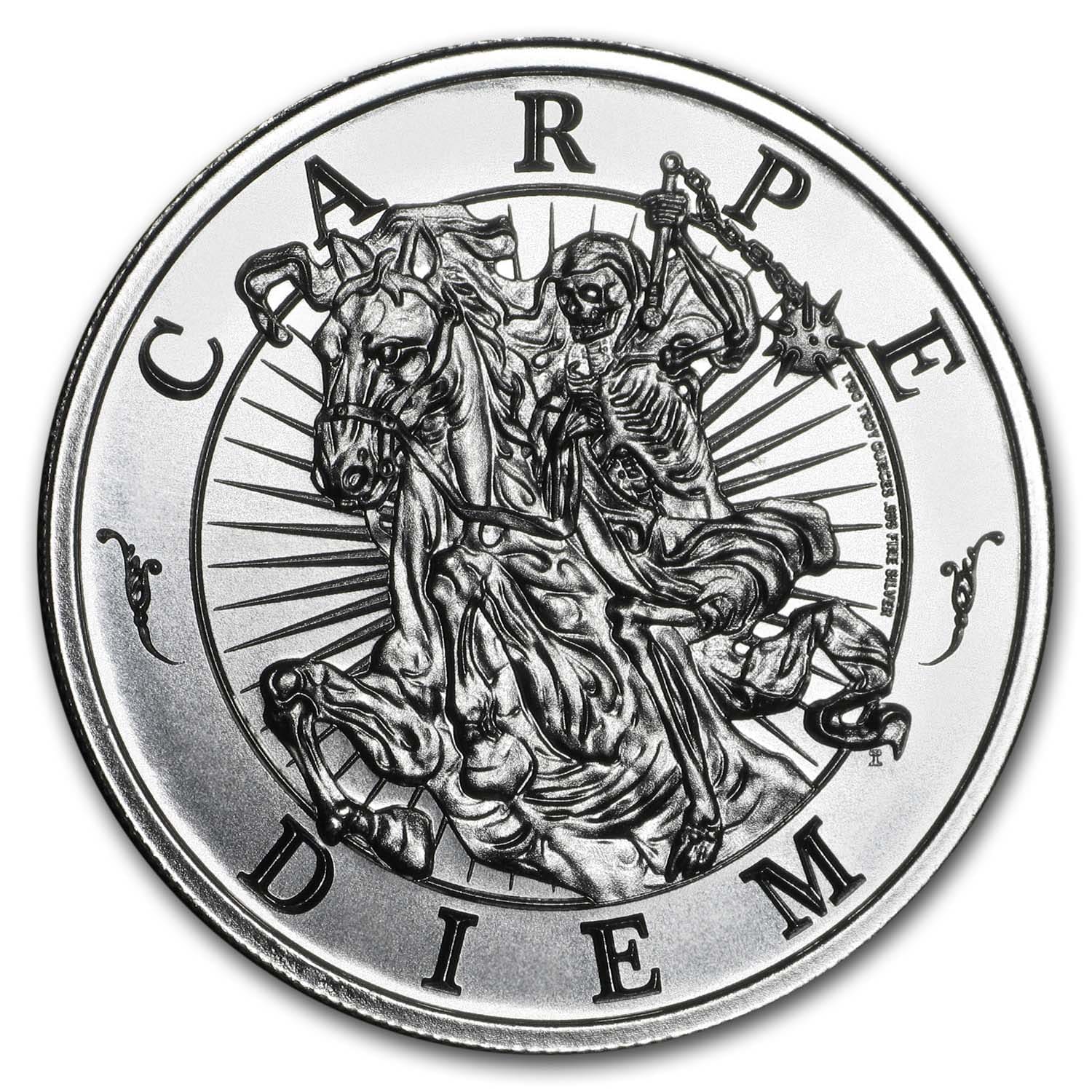 - Reverse: Displays the word CARPE encircles the top field, and the word DIEM in the bottom field, separated by artistic flourishes surround a draped skeleton mounted upon an apocalyptic horse, wielding a medieval spiked flail.