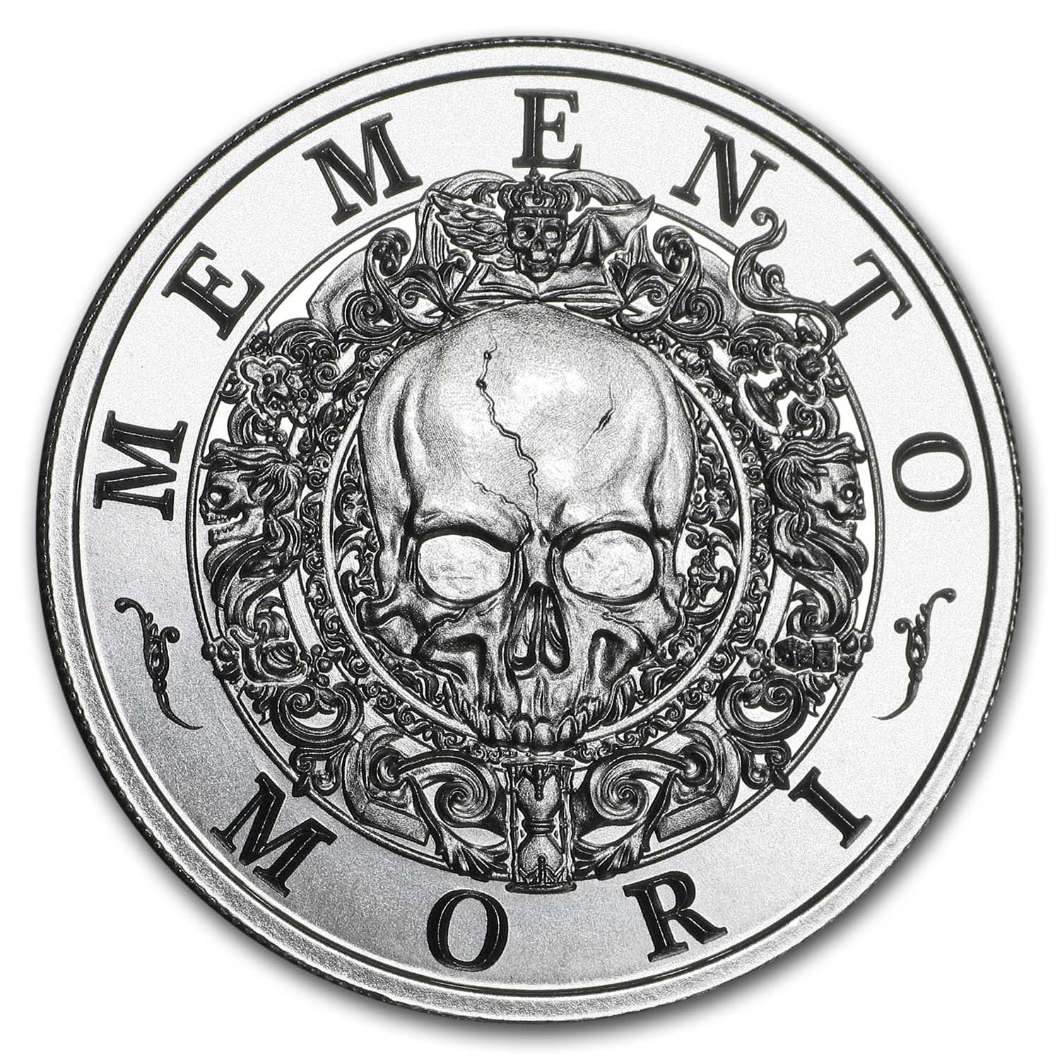 - Obverse: Displays the word MEMENTO encircles the top field, and the word MORI in the bottom field, separated by artistic flourishes surround a skull in the center surrounded by items significant to the phrase, including an hourglass at 6 oclock, a crowned skull with wings of good and evil (depicting the ascent to heaven) at 12 oclock, skulls opposing at 3 and 9 oclock, an extinguished candle, dice showing a roll of 7, a snail and a flower.