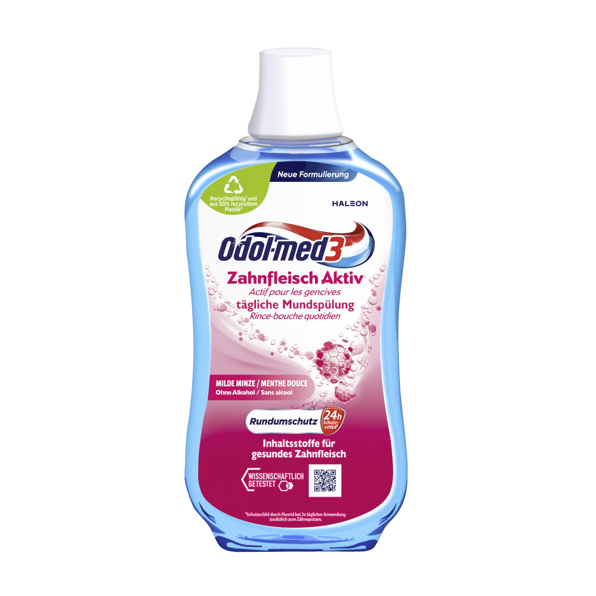 Die Odol-med3 Zahnfleisch Aktiv Mundspülung wurde speziell für die tägliche Pflege von empfindlichem und beanspruchtem Zahnfleisch entwickelt. Sie unterstützt die Mundhygiene gezielt, schützt vor Zahnfleischproblemen und sorgt mit milder Minze für ein angenehm frisches Mundgefühl – ganz ohne Alkohol.