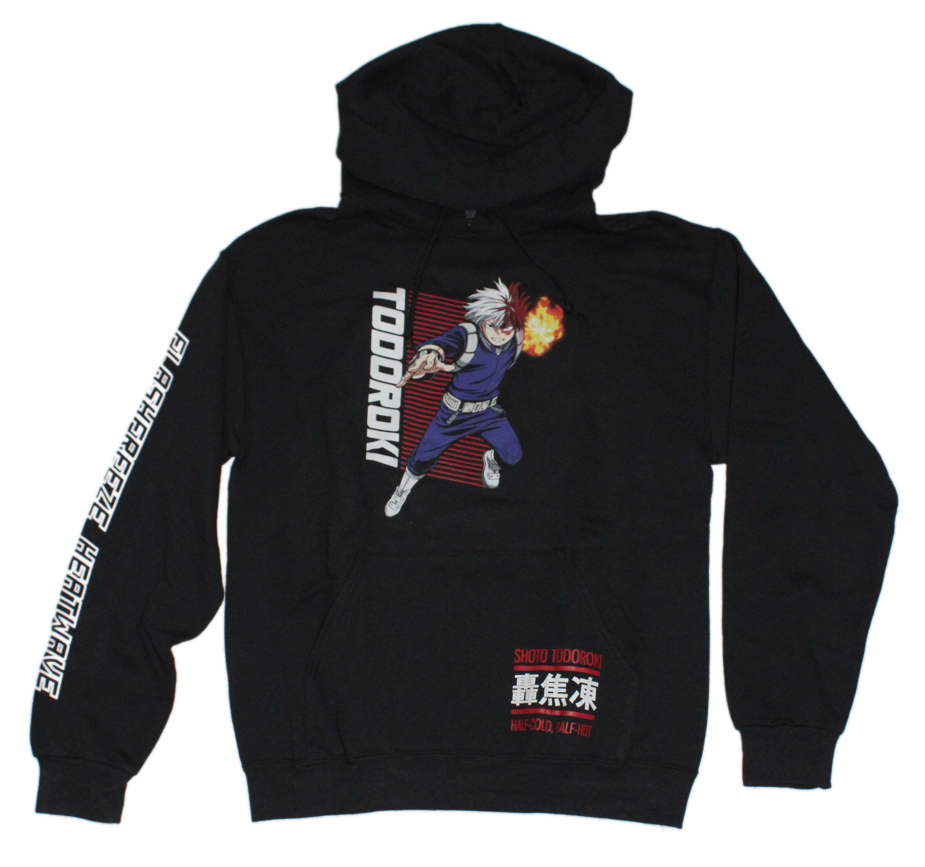 But the artistry doesn't stop there. The sleeves of this hoodie are adorned with the words "Flash Freeze" and "Heat Wave," capturing the elemental extremes of Todoroki's powers. Each sleeve proudly displays one of these phrases, symbolizing the contrasting forces within him and the devastating impact they can have.