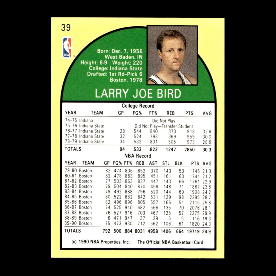 | Description: | Larry Bird | | Category: | Basketball | | Year: | 1990 | | Product: | Hoops | | Team: | Boston Celtics | | Card Number: | 39 | | Dimensions: | 3½" x 2½" |