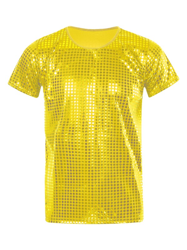 Man stage top is allover with sequin dot, and designed with round neck and short sleeve, which is a must-have top for party.