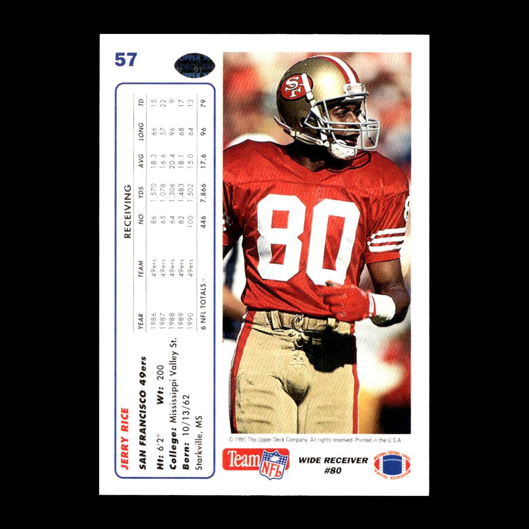 | Description: | Jerry Rice | | Category: | Football | | Year: | 1991 | | Product: | Upper Deck | | Team: | San Francisco 49ers | | Card Number: | 57 | | Dimensions: | 3½" x 2½" |