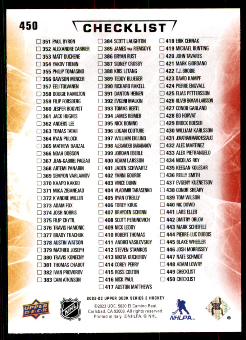 | Description: | Charlie McAvoy/Moritz Seider | | Category: | Hockey | | Year: | 2022 | | Product: | Upper Deck. | | Team: | Hockey Cards | | Card Number: | 450 | | Dimensions: | 3½" x 2½" | | SKU: | HK B0001 R03 D (24) |