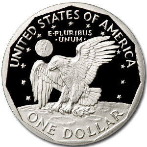 • Reverse: Gasparro's adaptation of the Apollo 11 insignia, depicting an eagle bearing an olive branch landing on the moon, as originally seen on the Eisenhower Dollar.