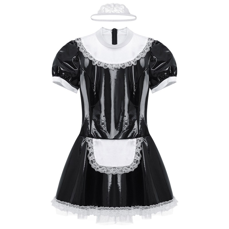 Women’s maid dress-up dress adopts satin and patent leather patchwork, integrated apron, short puff sleeve and back zipper closure.