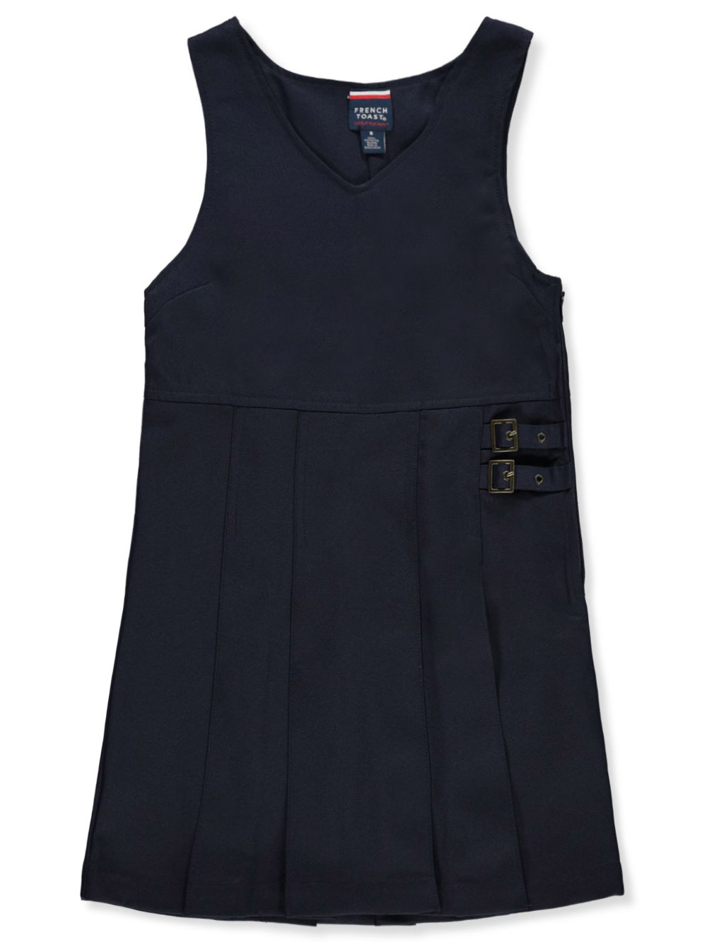 This jumper from French Toast is a comfy school classic. French Toast jumper Polyester construction Pleated style Back-zip closure Double buckle design 100% polyester Machine wash cold Made in Bangladesh