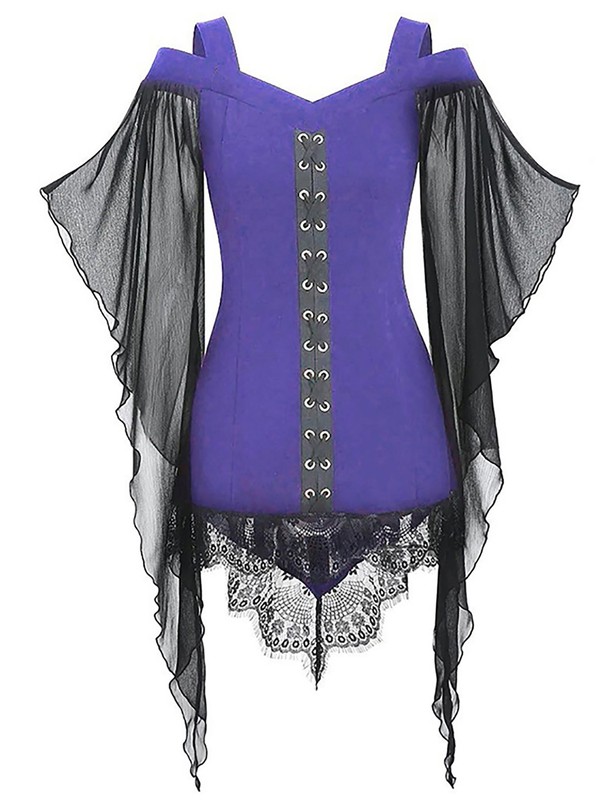 Designed with off-shoulder, v neck, mesh flare sleeve, lace-up, high-low hem with eyelash lace trim, which is ideal for cosplay.