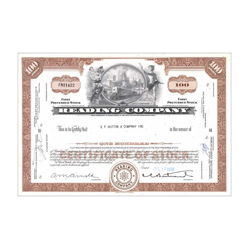 A stock certificate is a physical piece of paper representing ownership in a company. Stock certificates include information such as the shareholder name, number of shares owned, date issued, an identification number, and usually a corporate seal and signatures. Unlike a stock, a bond is a fixed income instrument that represents a loan made by an investor to a borrower, typically a government or corporation, to finance projects and operations. A bond certificate includes the loan terms, bond holder, principal due date, schedule of interest payments, and usually a corporate seal and signatures. Many vintage bond certificates also include attached interest payment coupons, which needed to be physically cut off the bond and redeemed for each interest payment.