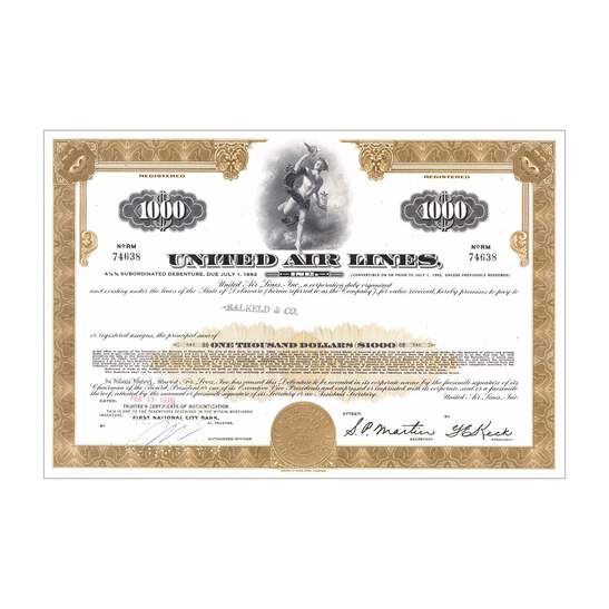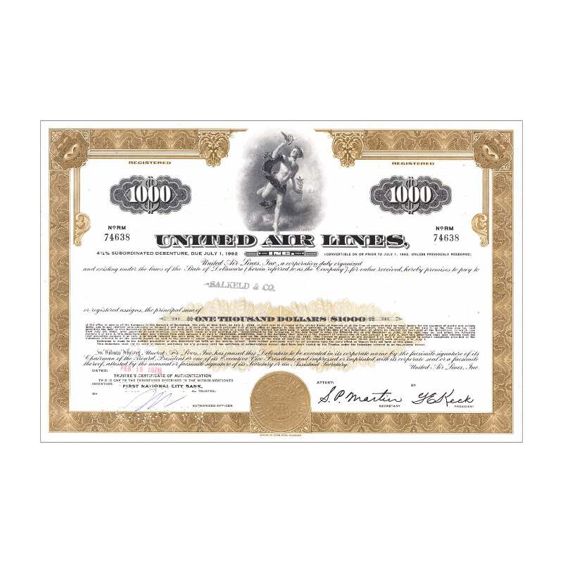 A stock certificate is a physical piece of paper representing ownership in a company. Stock certificates include information such as the shareholder name, number of shares owned, date issued, an identification number, and usually a corporate seal and signatures. Unlike a stock, a bond is a fixed income instrument that represents a loan made by an investor to a borrower, typically a government or corporation, to finance projects and operations. A bond certificate includes the loan terms, bond holder, principal due date, schedule of interest payments, and usually a corporate seal and signatures. Many vintage bond certificates also include attached interest payment coupons, which needed to be physically cut off the bond and redeemed for each interest payment.