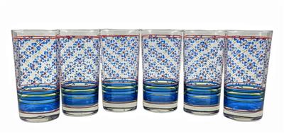 Vintage Set of 6 Pretty Glass Tumblers done in a Blue & Red Flower Pattern done in translucent paint to create a stained glass appearance. Measures 5 1/2" tall.