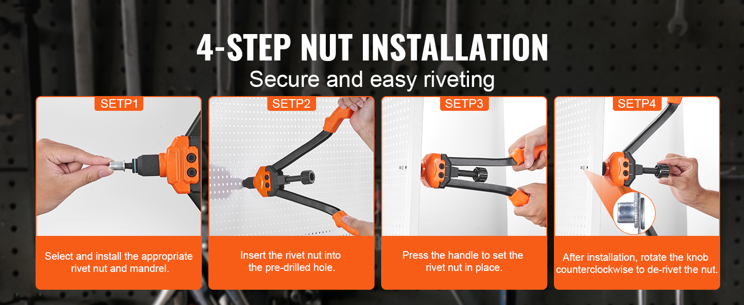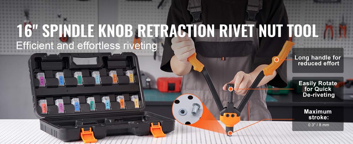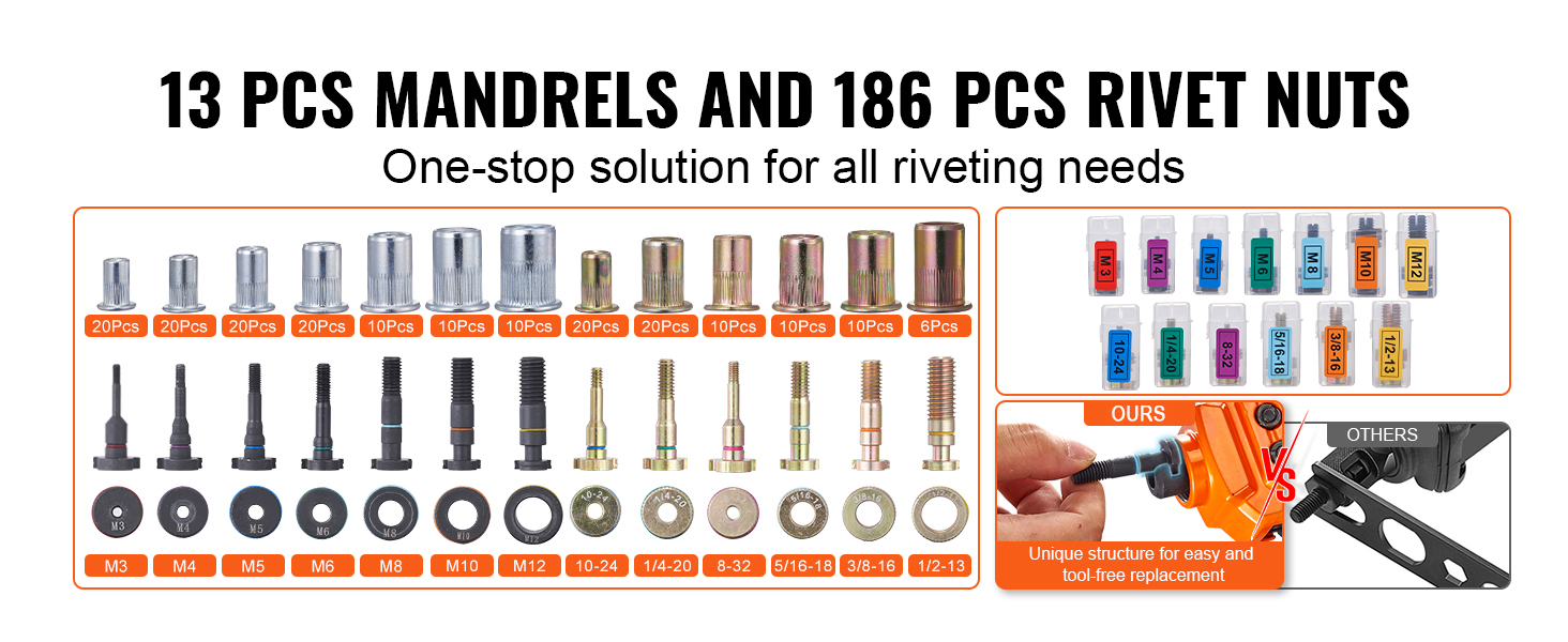 Our nutsert tool kit includes 13 sets of mandrels and nuts, suitable for metalwork, woodwork, furniture-making, electronics, etc. Quick and tool-free replacement allows you to meet various task requirements without buying multiple tools. All accessories are neatly stored in a portable case.