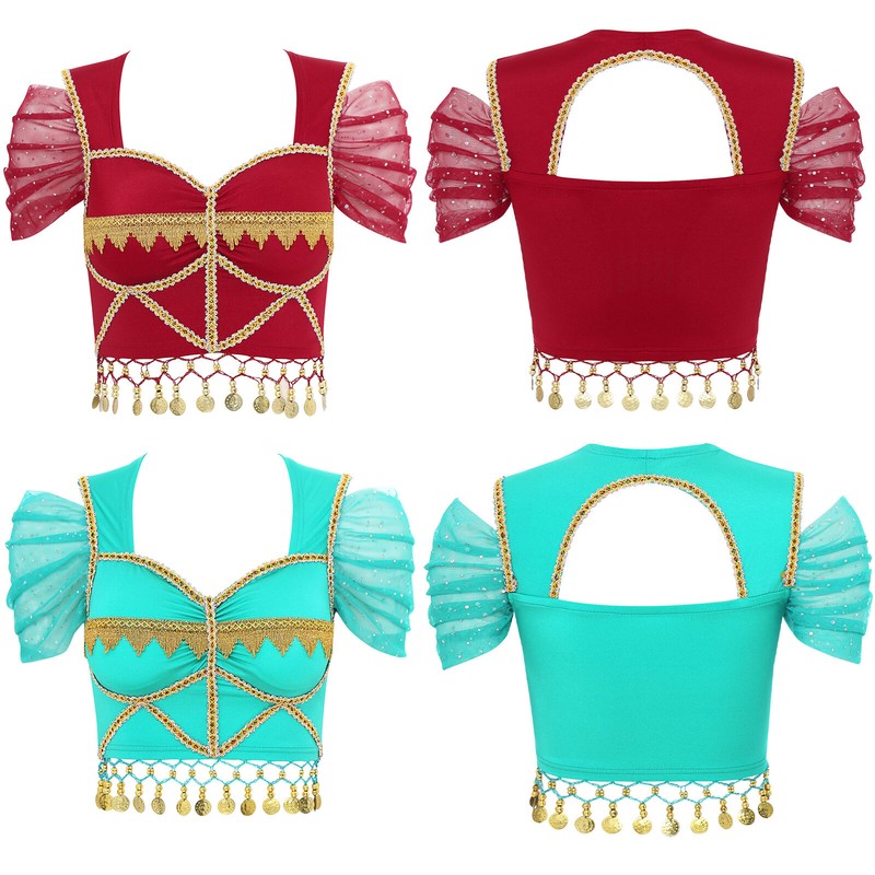 Women circus cosplay bodysuit designs with long sleeve, tassel epaulettes, button crotch and patchwork tails skirted.