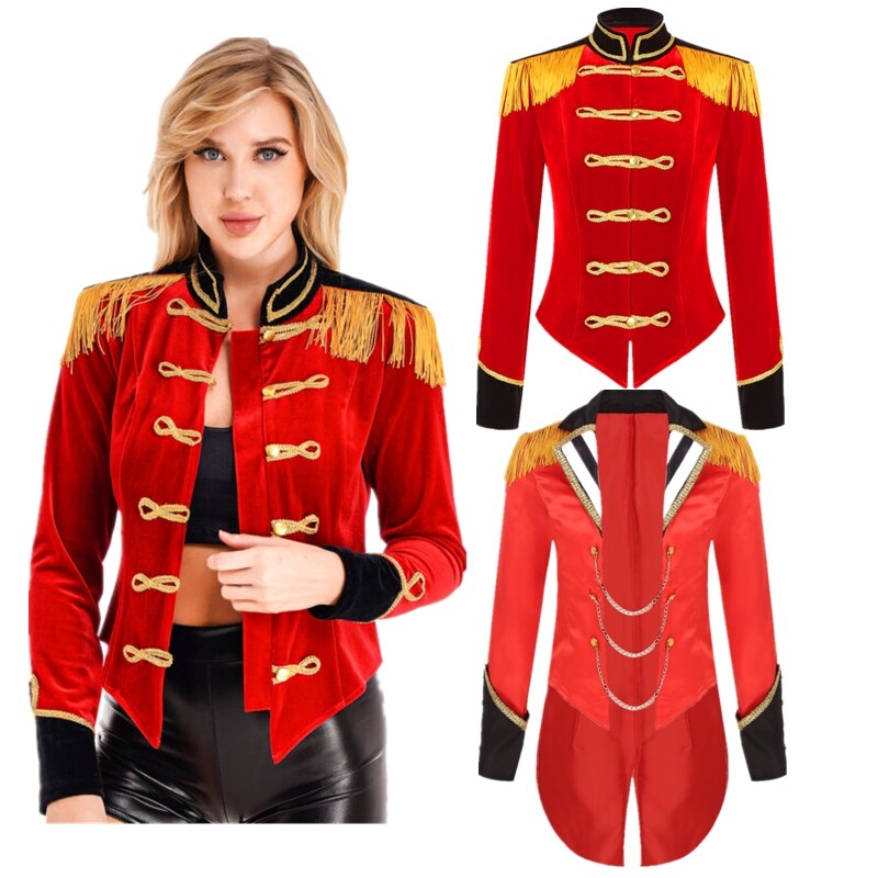 Attaches with tassel epaulettes, handmade vintage buttons, creating a perfect circus ringmaster look for party.