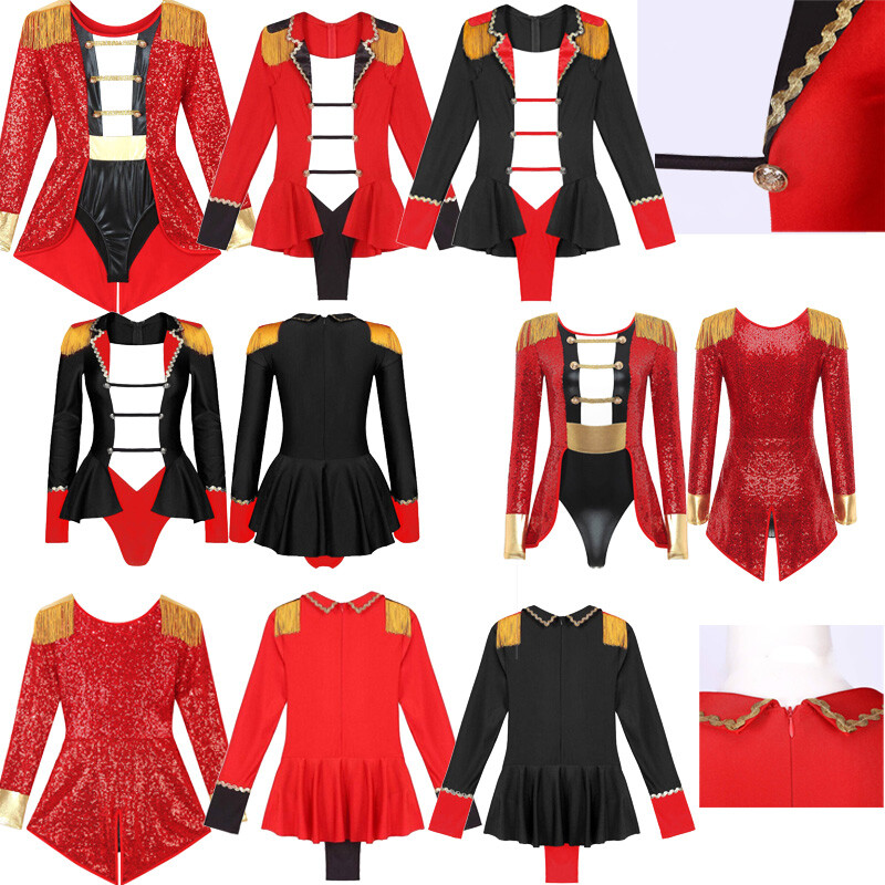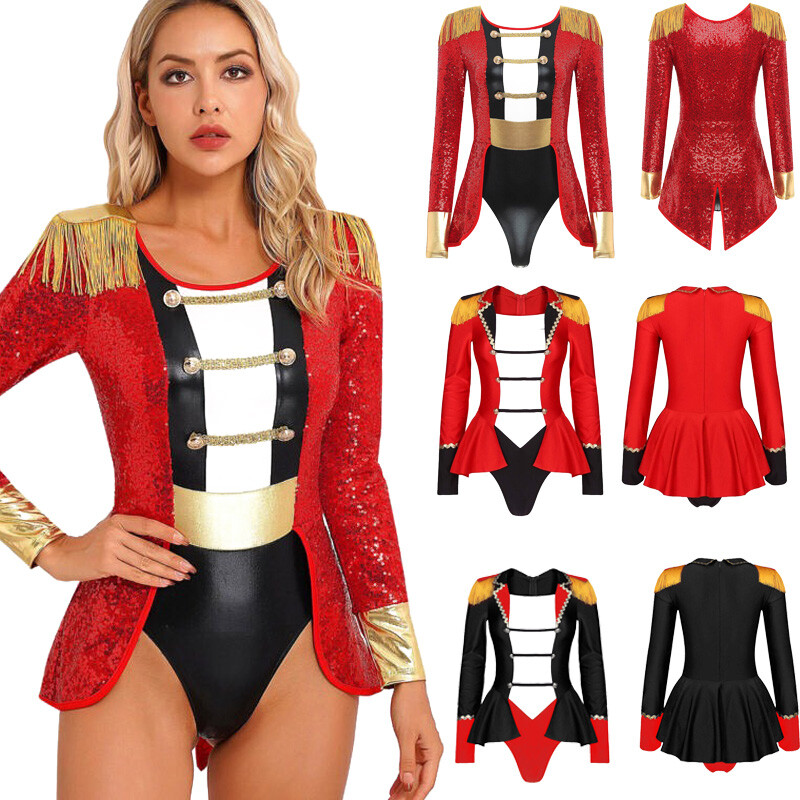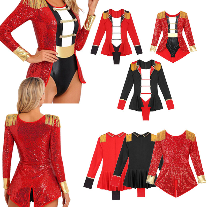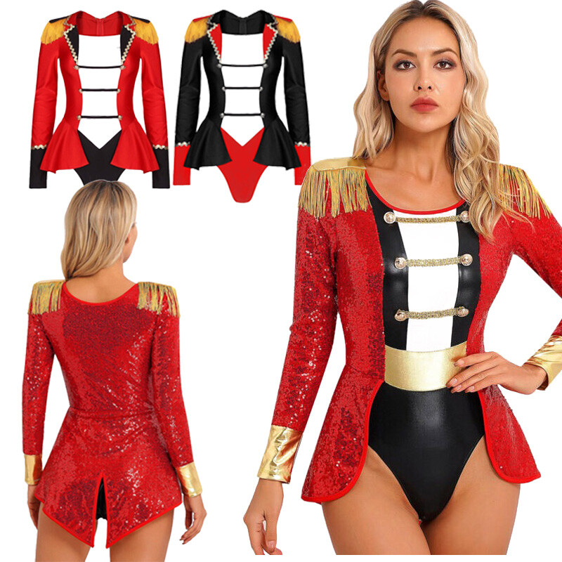 Womens Circus Ringmaster Costume Halloween Showman Long Sleeve Bodysuit.