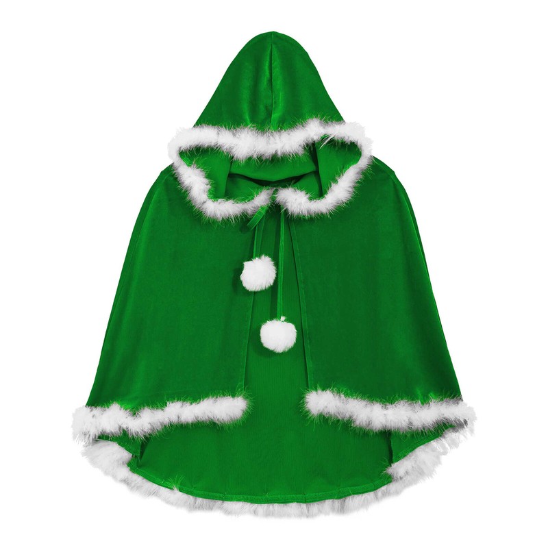 Kids Girls Christmas Costume Pure Color Hooded Faux Fur Pompoms Adorned Cloak Cape.