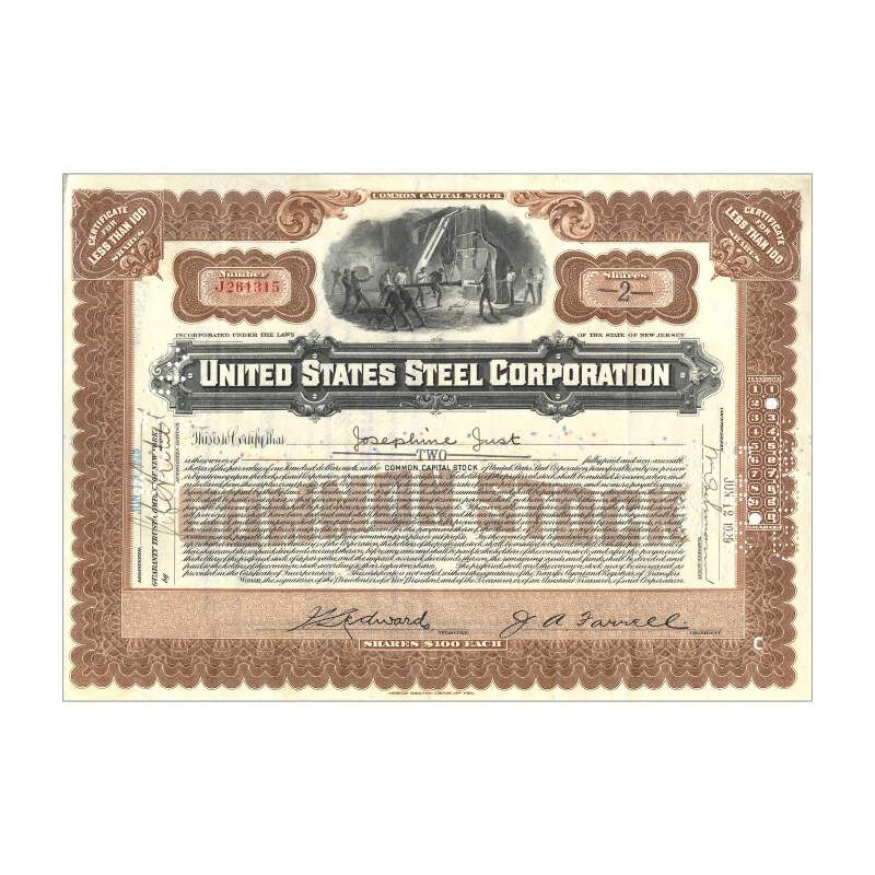 A stock certificate is a physical piece of paper representing ownership in a company. Stock certificates include information such as the shareholder name, number of shares owned, date issued, an identification number, and usually a corporate seal and signatures. Unlike a stock, a bond is a fixed income instrument that represents a loan made by an investor to a borrower, typically a government or corporation, to finance projects and operations. A bond certificate includes the loan terms, bond holder, principal due date, schedule of interest payments, and usually a corporate seal and signatures. Many vintage bond certificates also include attached interest payment coupons, which needed to be physically cut off the bond and redeemed for each interest payment.