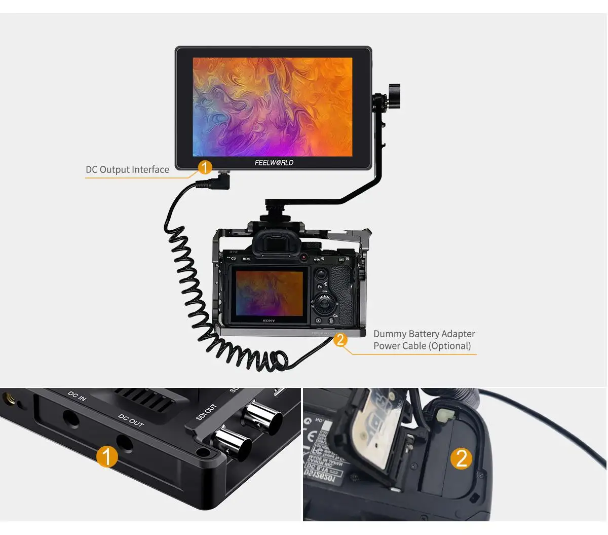 The SH7 is not only equipped with DC IN 12V (suit for use 12/1.5A adapter), but also provides auxiliary power out (DC OUT 8V) allowing shooters to power their cameras. With a battery adapter cable (Optional), the SH7 extends camera run-time, while providing a more usable display