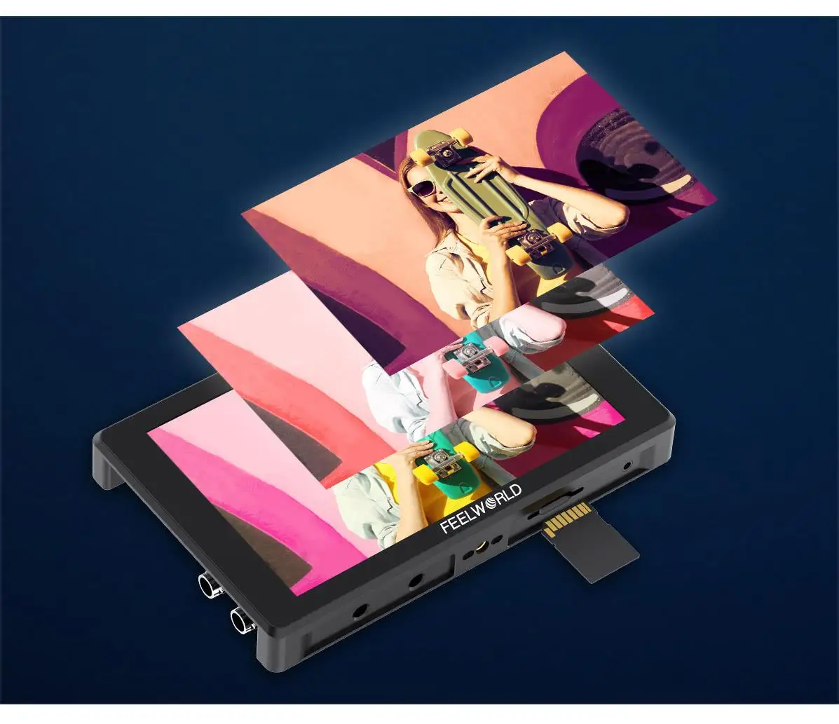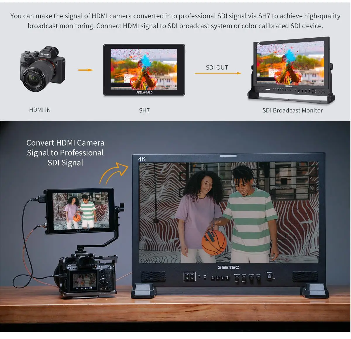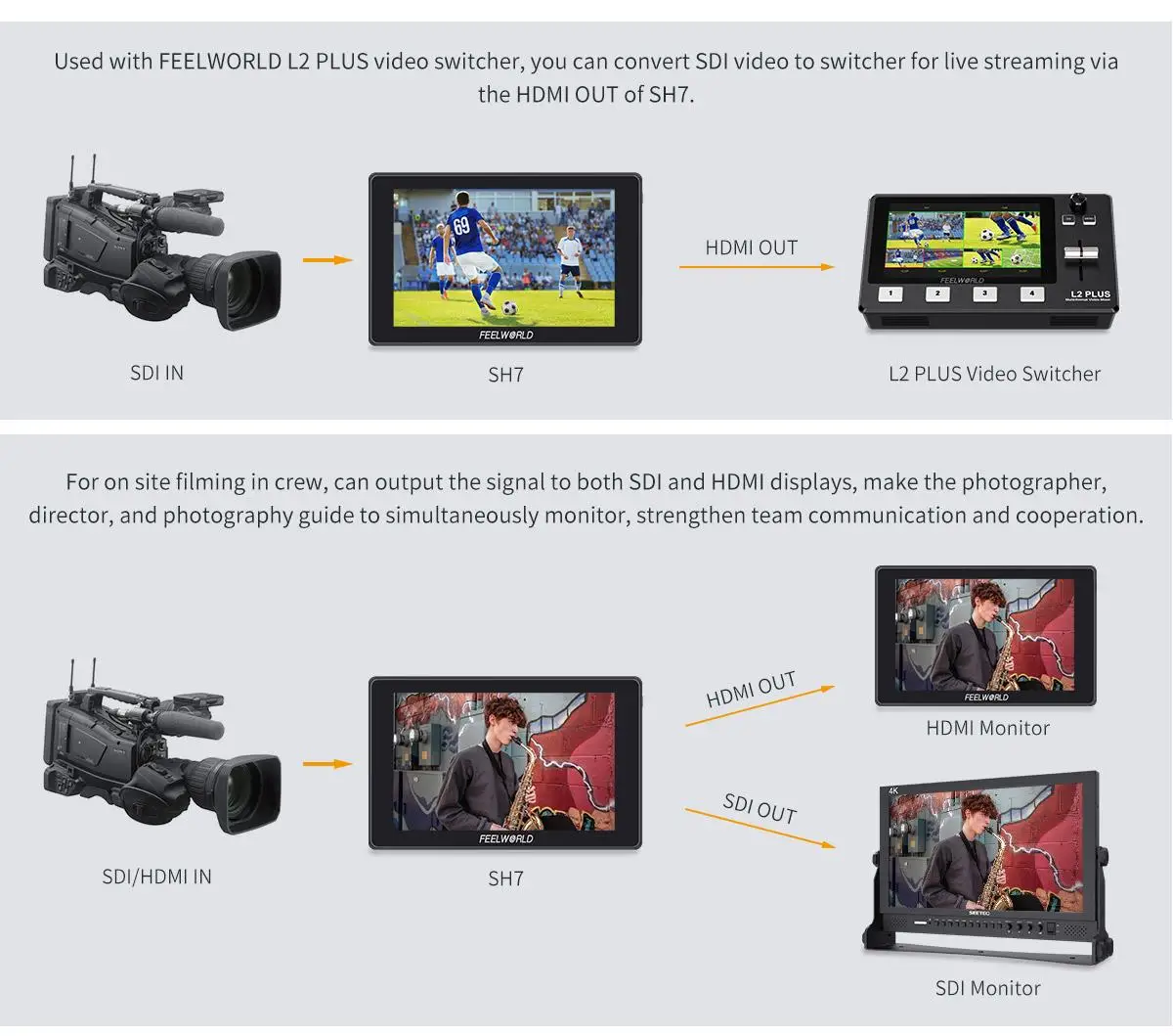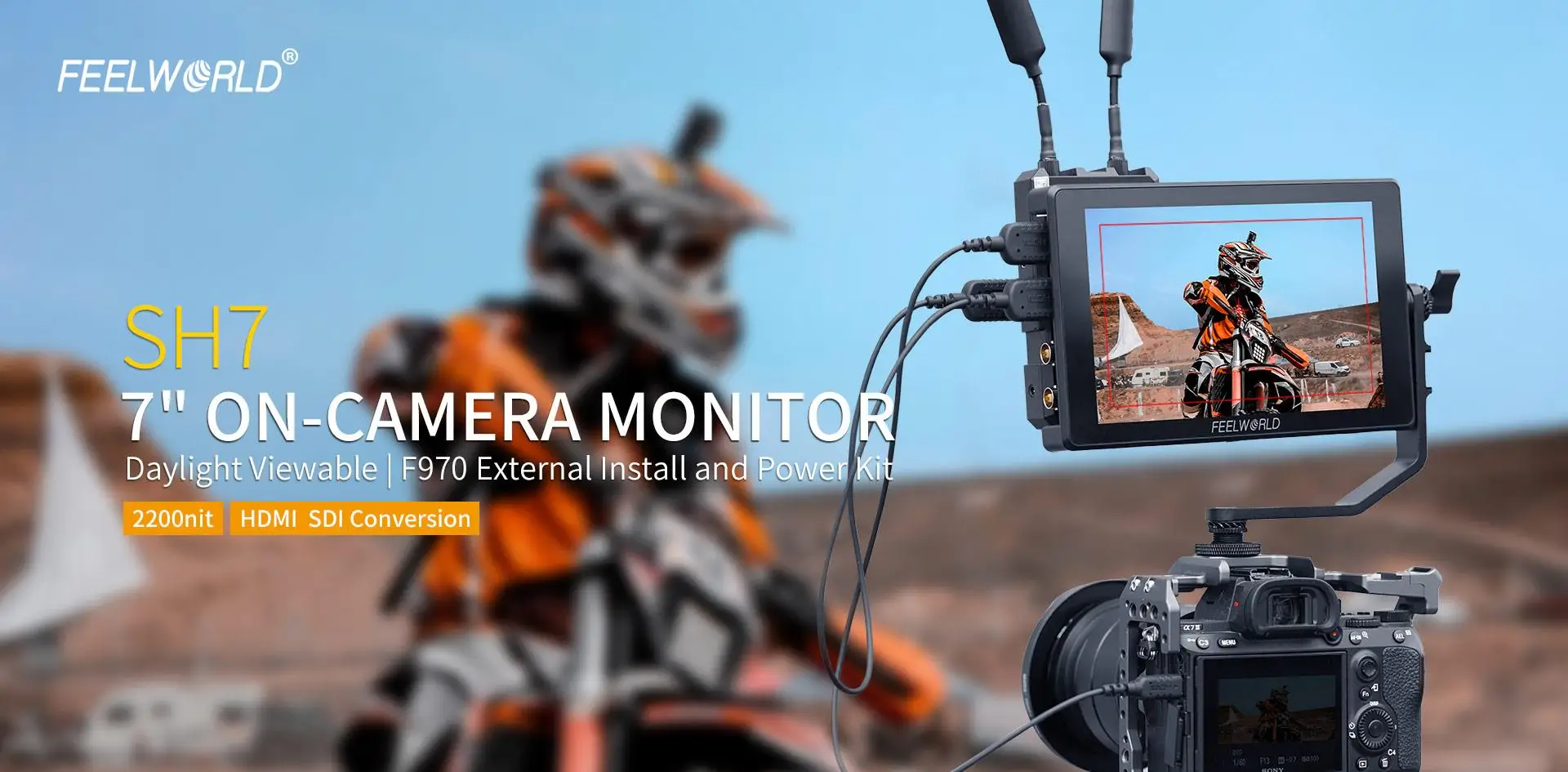 Do you want to create freely in the brightest environment and share your creation on-set? FEELWORLD SH7 with peak brightness of 2200nit which can be used in the brightest of environments, and packed a series of powerful functions.You can easily convert SDI signal input to HDMI output, or you can convert HDMI input to SDI output; you can also output the HD video or image with LUT effect to the director for real-time monitoring in field; by using the F970 external kit on the rear of the monitor, wireless transmission and other devices can be installed to reduce on-site wiring worries. An ideal directors’ monitor, focus pullers’ monitor, program or preview display for video switchers, and perfect for vloggers presenting to camera.